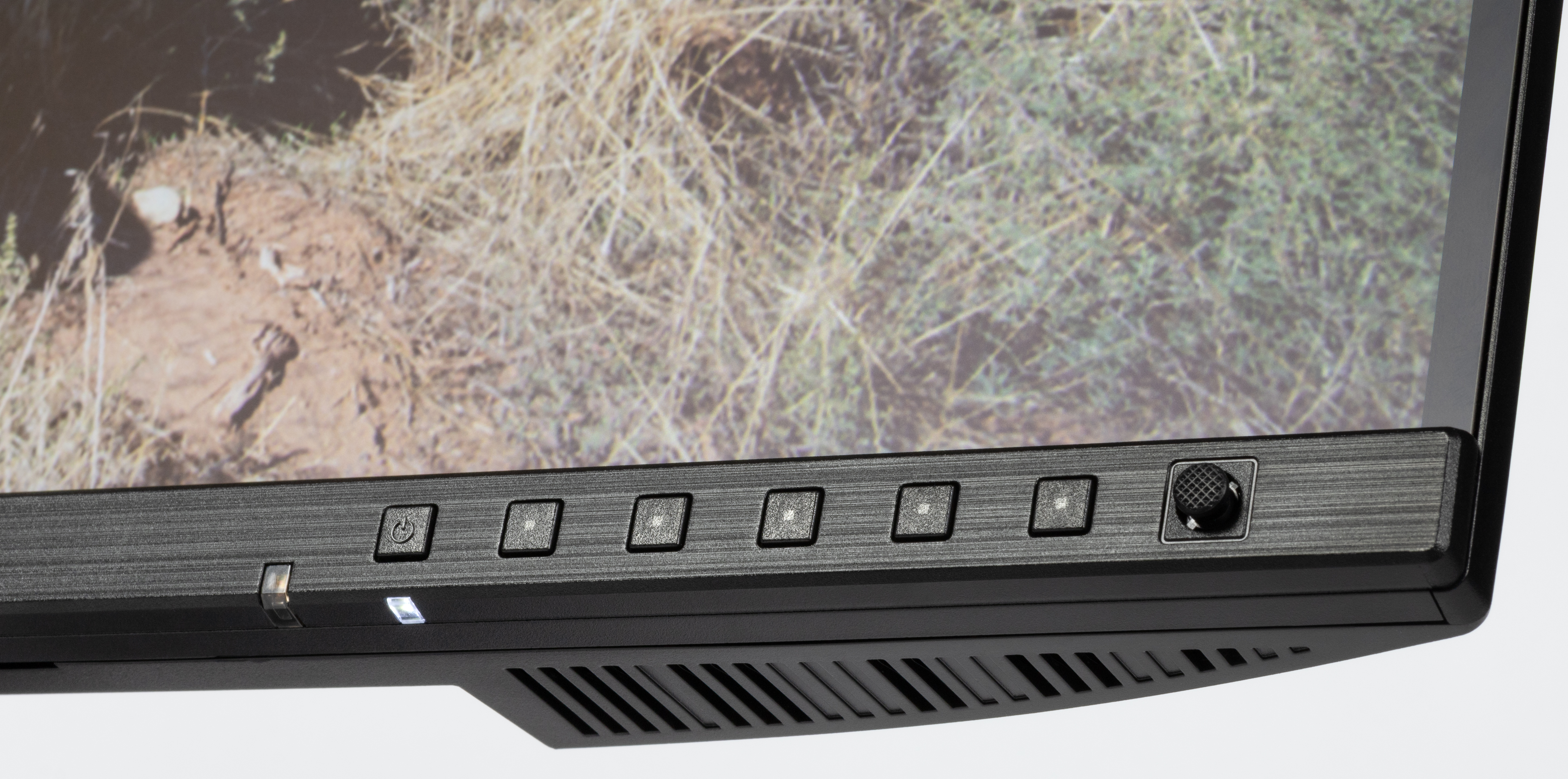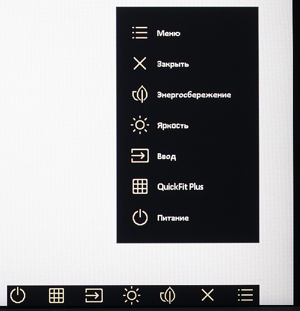 Индикатор питания при работе неярко светится белым (это можно отключить), в режиме ожидания — оранжевым и не горит, если монитор условно выключен. Когда монитор включен и на экране нет меню, то при любом нажатии на кнопки (кроме кнопки питания), или на джойстик, или отклонении джойстика на экран выводится стартовое меню, объясняющее, что произойдет при дальнейшем нажатии на кнопки или на джойстик.
