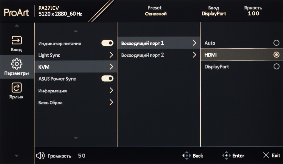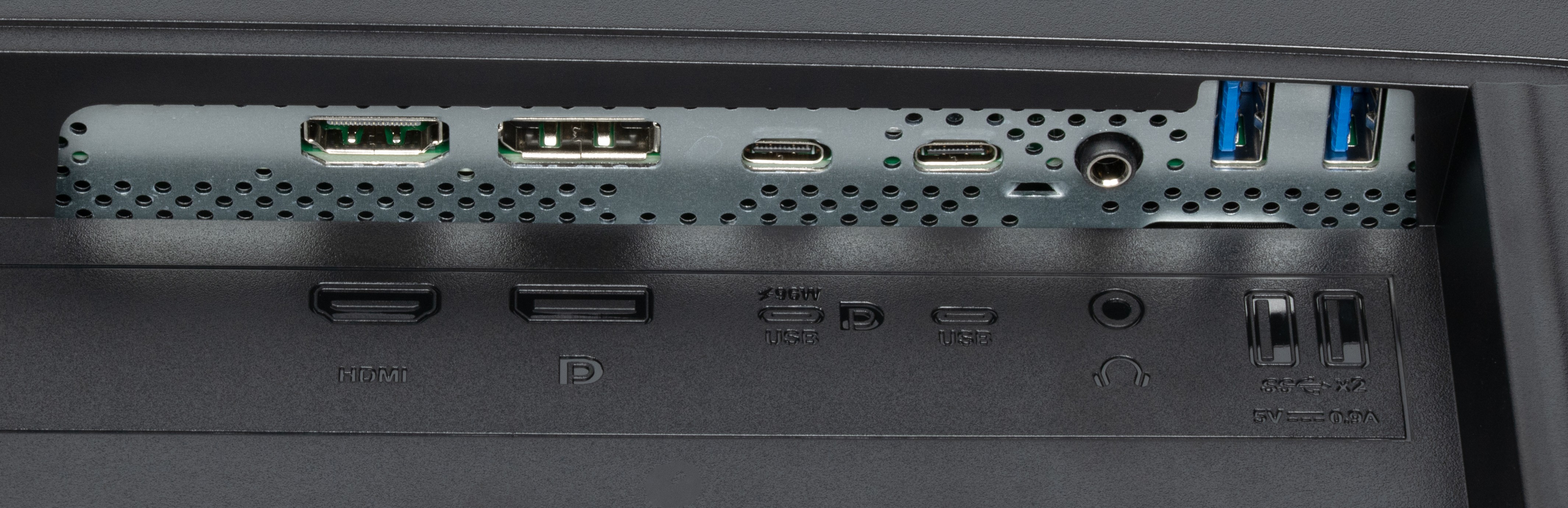 Представление об оснащенности интерфейсами дает таблица с характеристиками в начале статьи. Монитор имеет три цифровых входа, поддерживающих прием видеосигнала, — DisplayPort, HDMI и USB-C. Выбор входа осуществляется вручную, также есть отключаемая функция автоматического поиска сигнала на входах.