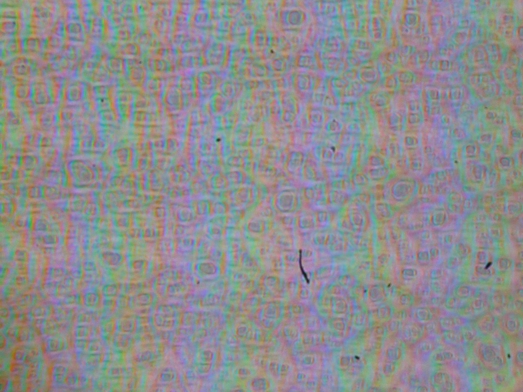 Зерно этих дефектов меньше размеров субпикселей (масштаб этих двух фотографий одинаковый), поэтому фокусировка на микродефектах и «перескок» фокуса по субпикселям при изменении угла зрения выражены слабо, но некоторые намеки на «кристаллический» эффект в виде вариации яркости и оттенка в масштабе субпикселей есть.