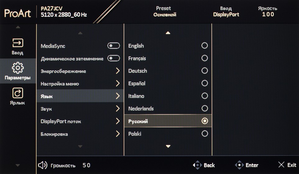 Навигация по меню очень удобная, так как все делается только джойстиком, не нужно переносить палец на кнопки, и количество необходимых действий разумно сокращено, к тому же списки зациклены. При настройке изображения меню остается на экране — это несколько мешает оценке вносимых изменений. При необходимости можно установить уровень прозрачности фона меню и выбрать тайм-аут автоматического выхода из меню. Есть русская версия экранного меню. Качество перевода на русский язык хорошее, но есть и непереведенные места, кириллический шрифт ровный и читаемый.