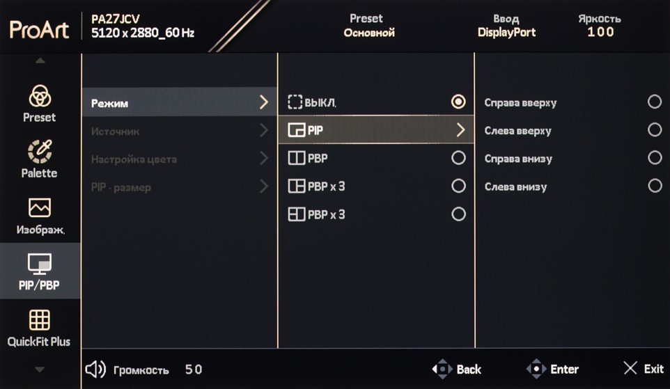 Присутствуют функции картинка-в-картинке (PIP) и картинка-рядом-с-картинкой (PBP). Во втором случае возможен вывод изображения от двух или трех источников.