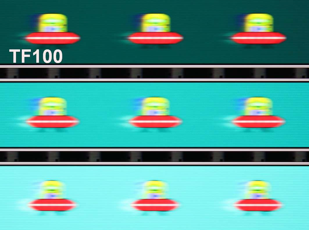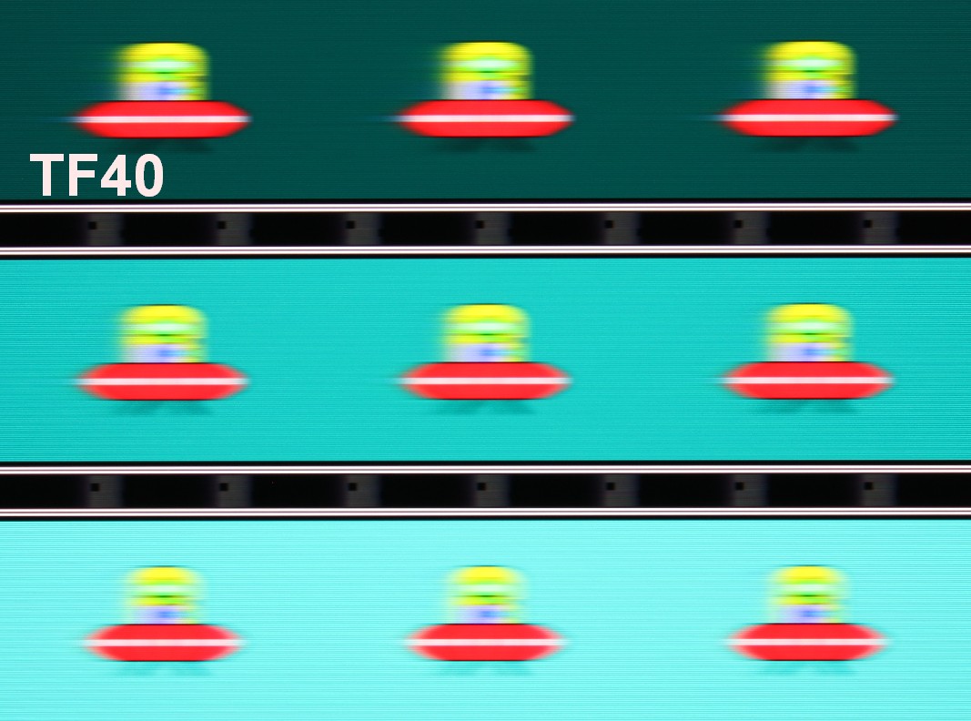 Для наглядного представления о том, что на практике означает такая скорость матрицы, и какие могут быть артефакты от разгона, приведем серию снимков, полученных с помощью движущейся камеры. Такие снимки показывают, что видит человек, если он следит глазами за двигающимся на экране объектом. Описание теста приведено тут, страница с самим тестом тут. Использовались рекомендованные установки (скорость движения 960 пиксель/с, выдержка 1/15 с). На фотографиях указаны значения Trace Free.