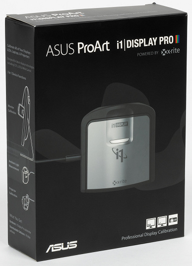 Чтобы у пользователя все же оказался в наличии подходящий инструмент, компания Asus предлагает этот монитор в комплектации, в которую входит колориметр X-Rite i1Display Pro. Такую комплектацию отличает буква K в наименовании модели — PA32UCX-PK. Коробочка с колориметром находится внутри коробки с монитором:
