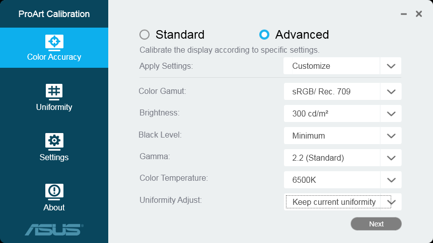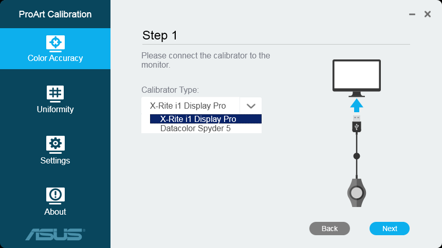 С монитором может работать фирменная программа Asus ProArt Calibration, с помощью которой можно аппаратно (с правкой внутренних таблиц монитора) откалибровать монитор и подправить равномерность яркости и цветового баланса по площади.