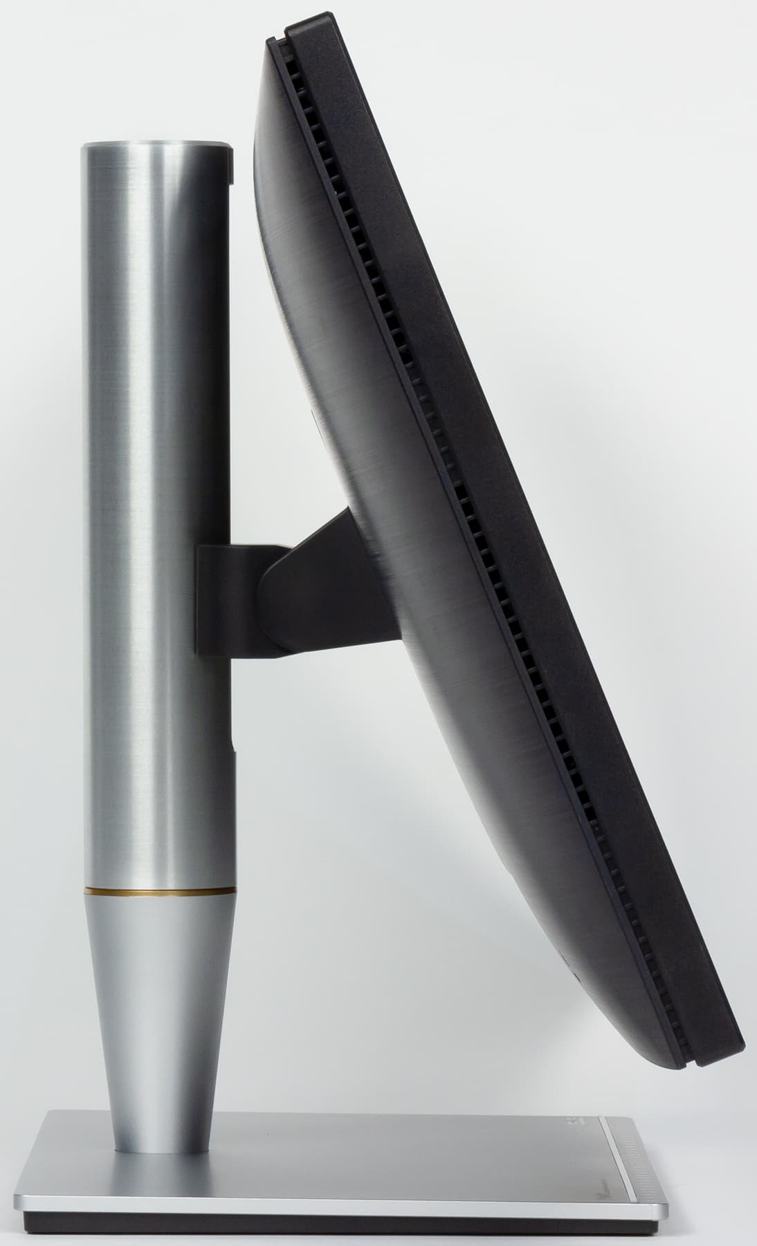 Стойка имеет фиксированную высоту, но подпираемый пружиной механизм обеспечивает вертикальное перемещение шарнира, на который крепится блок экрана. На этом шарнире закреплены сухари из скользкого пластика, которые скользят по направляющим в стойке. Скольжение облегчает консистентная смазка. В итоге легким движением руки экран можно установить на нужную высоту. Верхний шарнир допускает немного наклонять блок экрана вперед от вертикального положения, больше — назад, и переворачивать экран в портретную ориентацию по и против часовой стрелки.