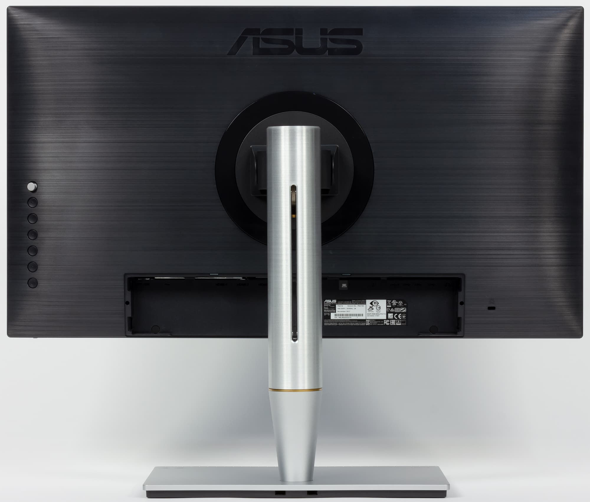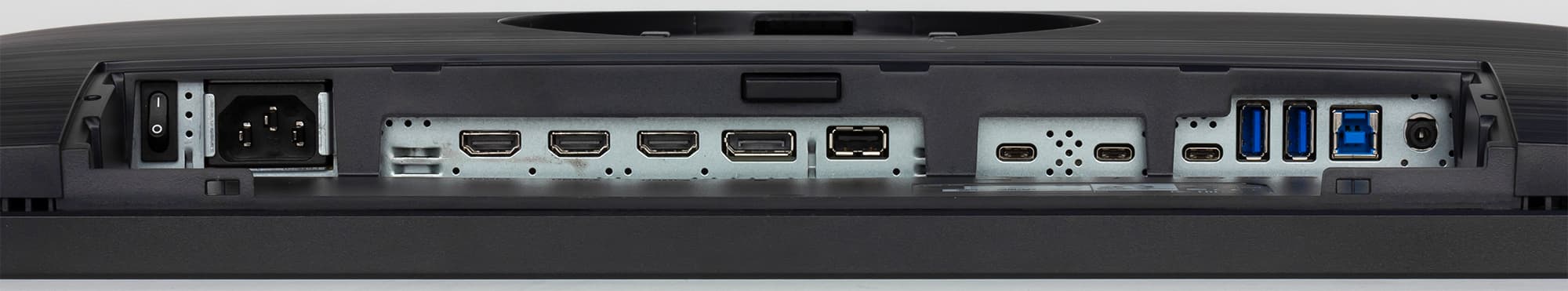 Все интерфейсные разъемы и разъем питания расположены в нише на задней панели и ориентированы вниз. Рядом с разъемом питания — механический выключатель питания. Подключать кабели к монитору удобно только при перевороте блока экрана в портретную ориентацию. Также на задней панели можно обнаружить разъем для кенсингтонского замка.