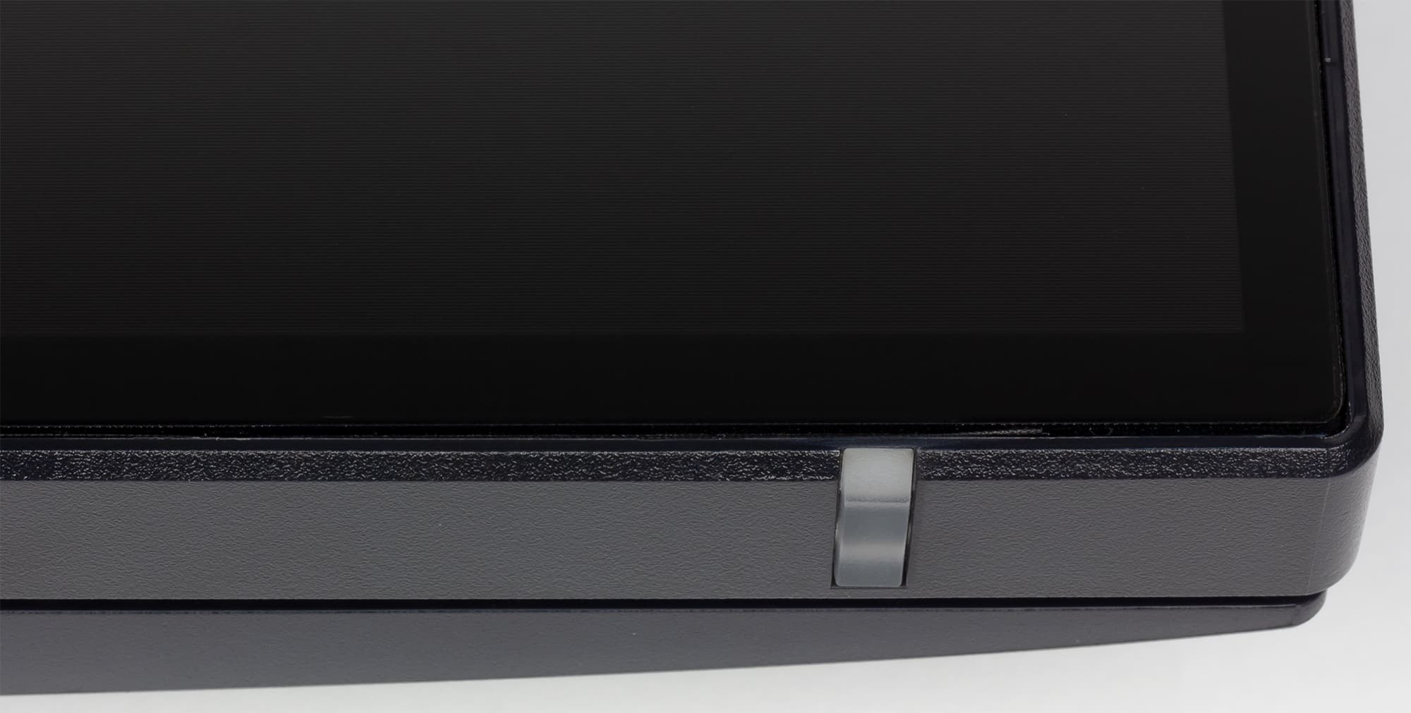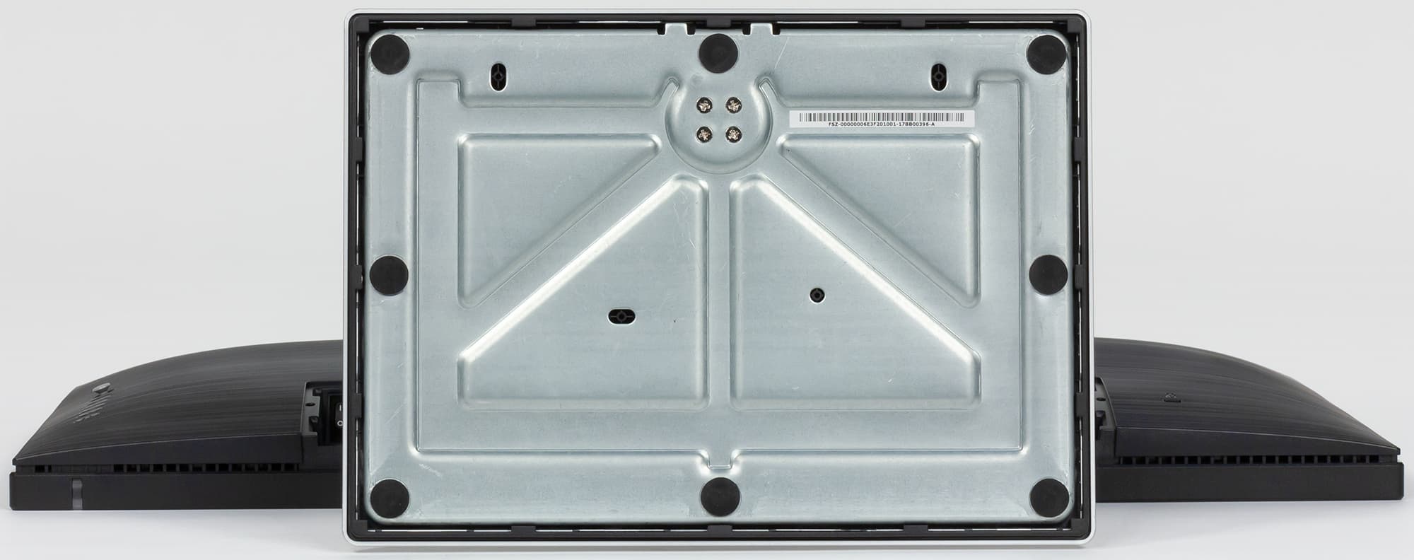 Фронтальная поверхность экрана выглядит как монолитная черная полуматовая (зеркальность выражена) плоскость, ограниченная по периметру узкой окантовкой. Поле от внешнего края до границы области отображения составляет 8 мм сверху и с боков и 9 мм снизу. Внешние панели блока экрана и часть кожухов подставки изготовлены из черного пластика в основном с немаркой матовой поверхностью. На задней панели есть мелкий рельеф в виде горизонтальных канавок. Кожухи на торце стойки сверху и на нижней части стойки, а также на основании сверху также пластиковые, но уже с матовым серебристым покрытием.