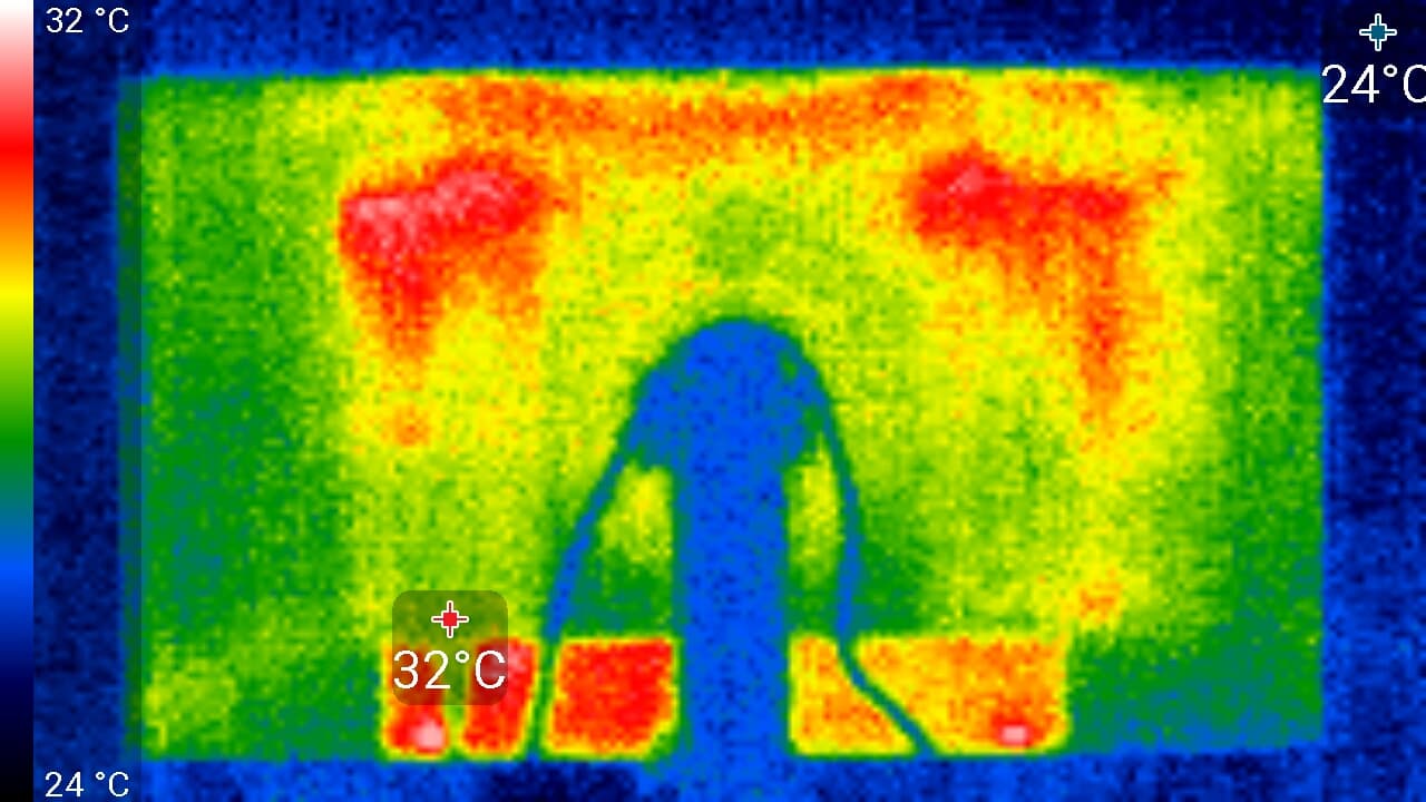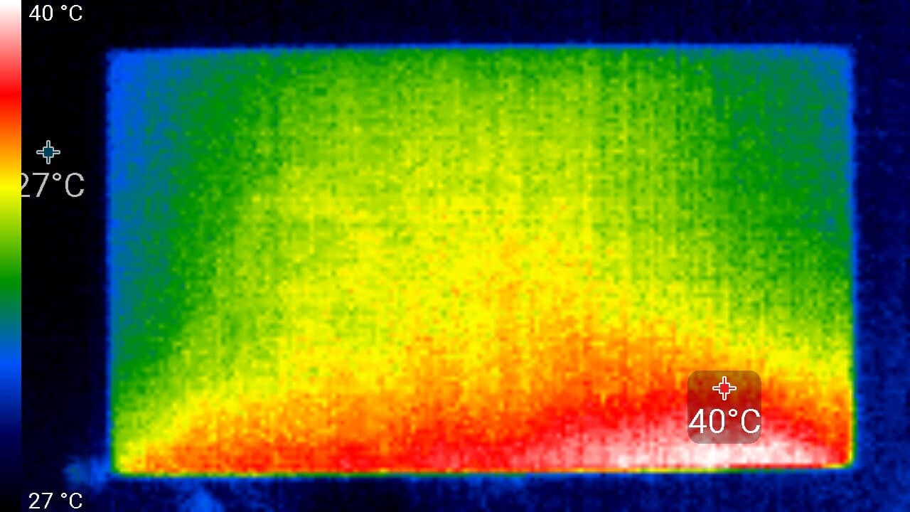 Спереди в нижней части экрана была зафиксирована температура в 40 °C — видимо, там находится светодиодная линейка подсветки экрана. Сзади нагрев незначительный.