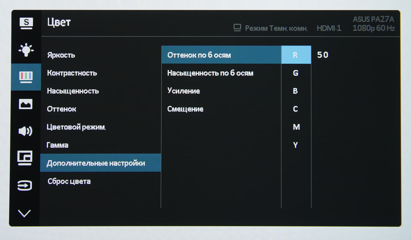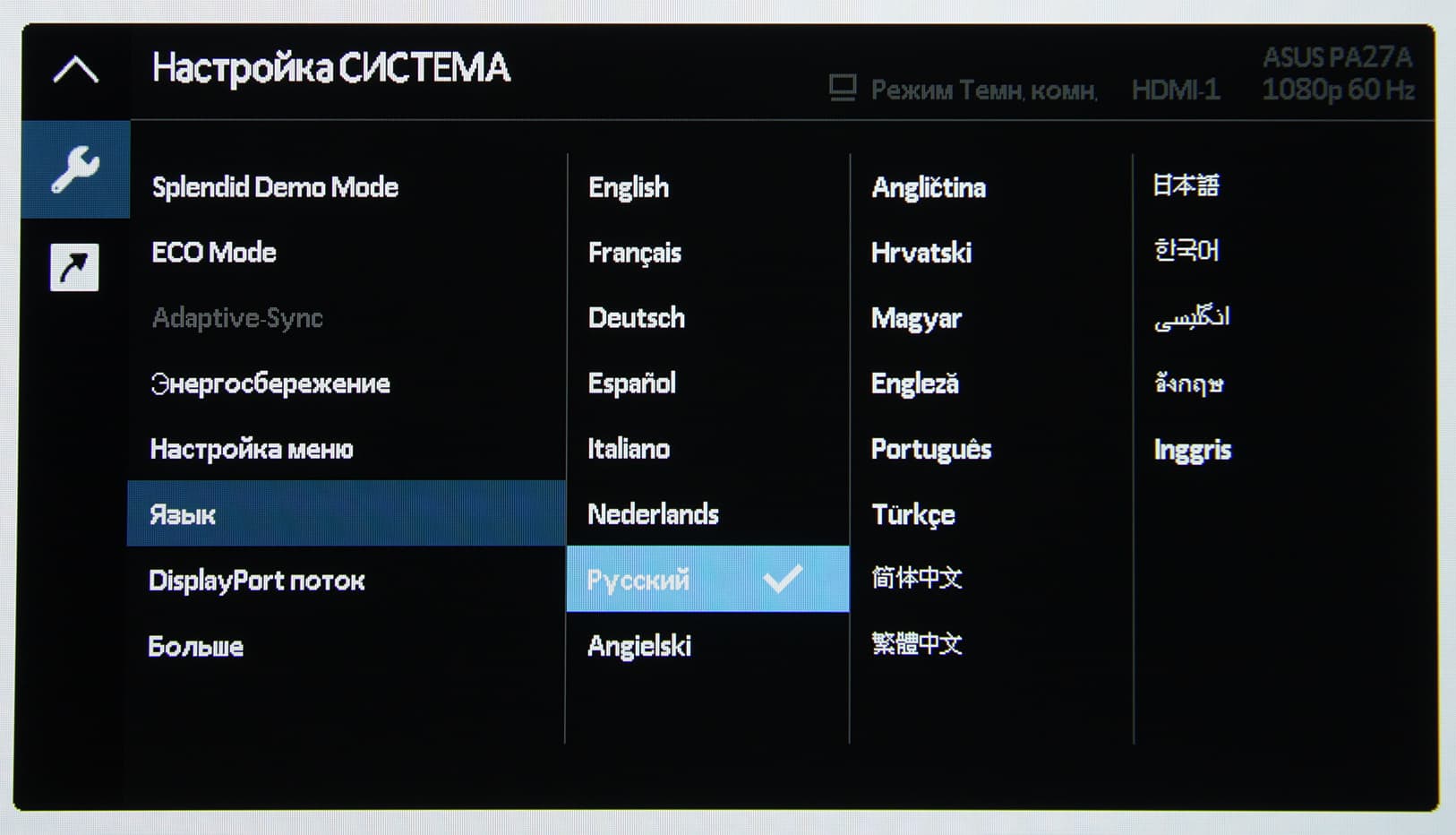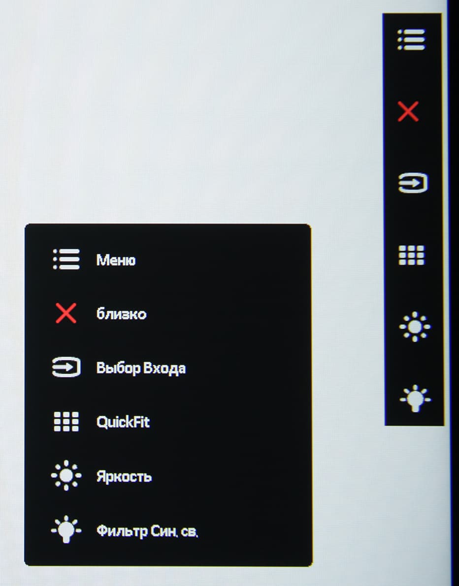 По умолчанию это регулировка яркости и снижение интенсивности синей компоненты. Также в коротком меню есть выбор входа, и вывод на экран сеток-шаблонов QuickFit (сетка для выравнивания, рамки A4 и B5 в ландшафтной и портретной ориентации с возможностью перемещения, рамка в формате пользователя, метрическая и дюймовая линейка). Пункт выхода из короткого меню по ошибке переведен как «близко», а первая строчка (нажатие на джойстик) — это вход в основное меню. Основное меню относительно большое. При настройке изображения меню остается на экране, что немного мешает оценке вносимых корректировок. Настраивается прозрачность фона и задержка автоматического выхода из меню. Есть возможность заблокировать все кнопки. Меню может автоматически менять ориентацию при перевороте экрана в портретный режим. Присутствует русская версия экранного меню.
