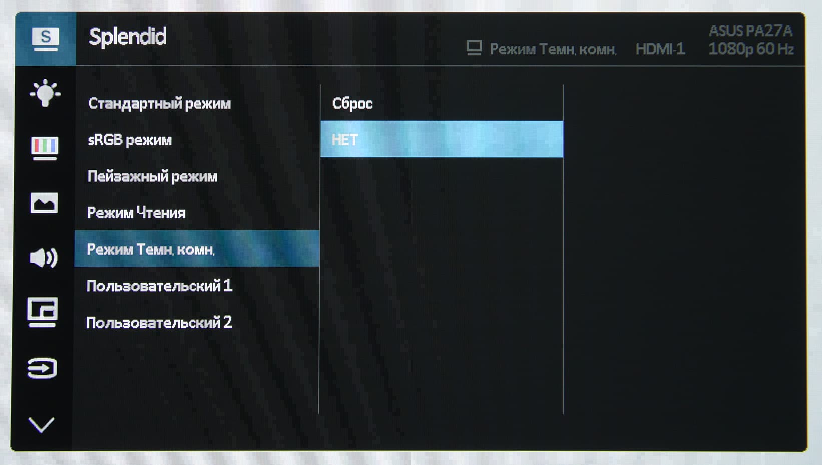 Доступность настроек зависит от выбранного профиля. Практически все настройки, кроме включения компенсации равномерности, доступны только при выборе профиля Режим Темн. комн., но в нем немного снижена максимальная яркость.