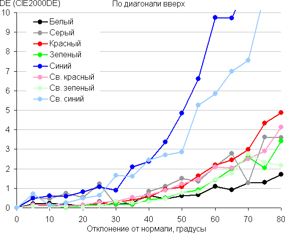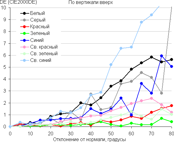 Для количественной характеристики изменения цветопередачи мы провели колориметрические измерения для белого, серого (127, 127, 127), красного, зеленого и синего, а также светло-красного, светло-зеленого и светло-синего полей во весь экран с использованием установки, подобной той, что применялась в предыдущем тесте. Измерения проводились в диапазоне углов от 0° (датчик направлен перпендикулярно к экрану) до 80° с шагом в 5°. Полученные значения интенсивностей были пересчитаны в ΔE относительно замера каждого поля при перпендикулярном положении датчика относительно экрана. Результаты представлены ниже: