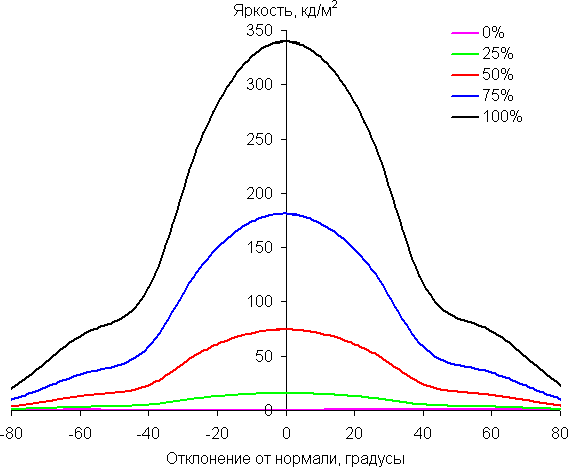 Отметим плавное уменьшение яркости при отклонении от перпендикуляра к экрану в горизонтальном направлении, при этом графики не пересекаются во всем диапазоне измеряемых углов. Чуть быстрее падает яркость при отклонении в вертикальном направлении. При отклонении в диагональном направлении поведение яркости оттенков имеет промежуточный характер между вертикальным и горизонтальным направлениями, за исключением яркости черного поля, которая начинает резко возрастать уже при 20°-30° отклонения от перпендикуляра к экрану. Если сидеть от экрана на расстоянии 50-60 см, то черное поле по углам будет заметно светлее, чем в центре. Контрастность в диапазоне углов ±82° в случае отклонения по диагонали приближается к отметке 10:1, но не опускается ниже.