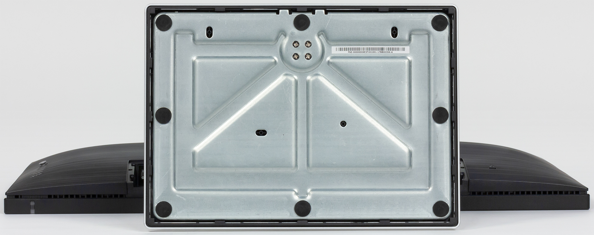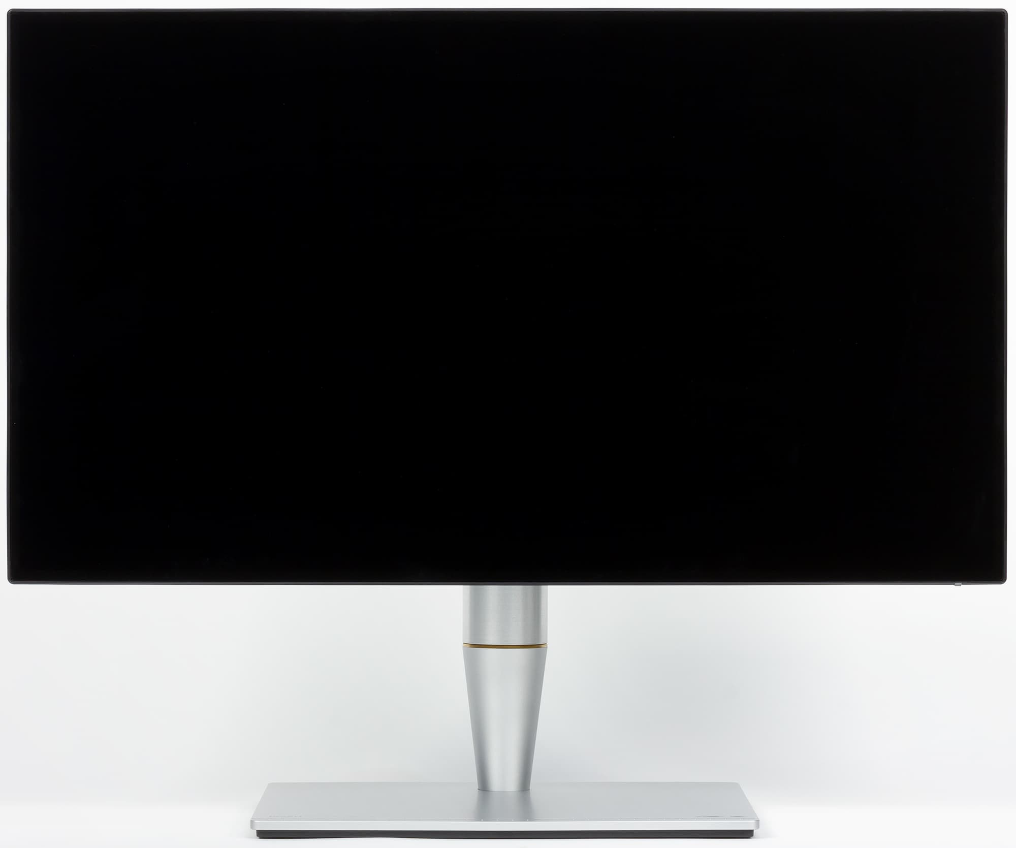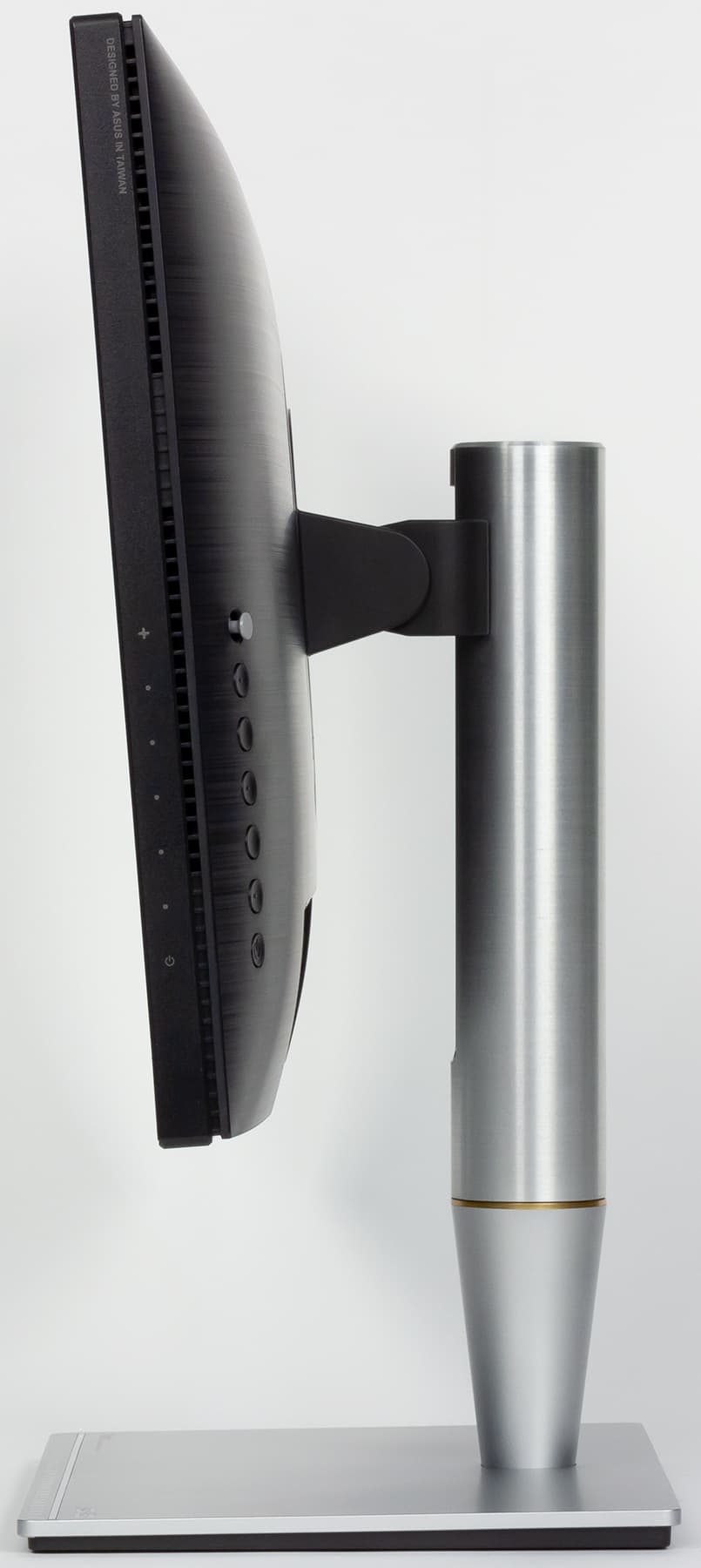 Цилиндрическая часть стойки — это цельнометаллическая фрезерованная деталь из алюминиевого сплава. Сзади на этой детали есть вертикальная прорезь, закрытая окошком из прозрачного пластика. Через прорезь видно оранжевую метку. Возможно, это имеет какую-то практическую ценность, например, пользователь может маркером отметить на стойке положение этой метки, которое соответствует оптимальной для него высоте блока экрана. В передней части основания подставки есть блестящая полоска и рельефные метки через сантиметр. Это уже точно исключительно декоративный элемент, как и оранжевая вставка между конусной и цилиндрической частями стойки. На шарнире в конусной части стойки блок экрана вместе с верхней цилиндрической частью стойки поворачивается вправо-влево. Несущие элементы стойки и основания подставки изготовлены из штампованной стали и из алюминиевого сплава. Снизу на основание подставки наклеены резиновые площадки, благодаря чему монитор фиксируется на гладких поверхностях и не царапает их при перемещении.