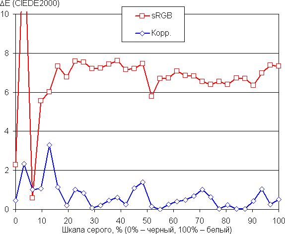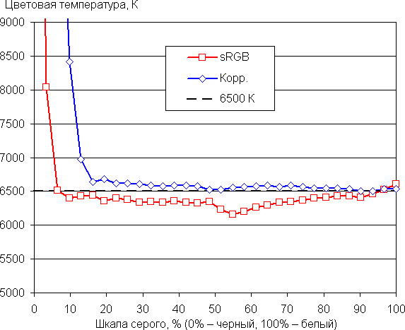 Цветопередача при выборе, например, профиля sRGB удовлетворит не очень требовательного пользователя. Мы попытались вручную скорректировать цветовой баланс, регулируя усиление трех основных цветов. Графики ниже показывают цветовую температуру на различных участках шкалы серого и отклонение от спектра абсолютно черного тела (параметр ΔE) без вмешательства (sRGB) и после ручной коррекции (Корр.):