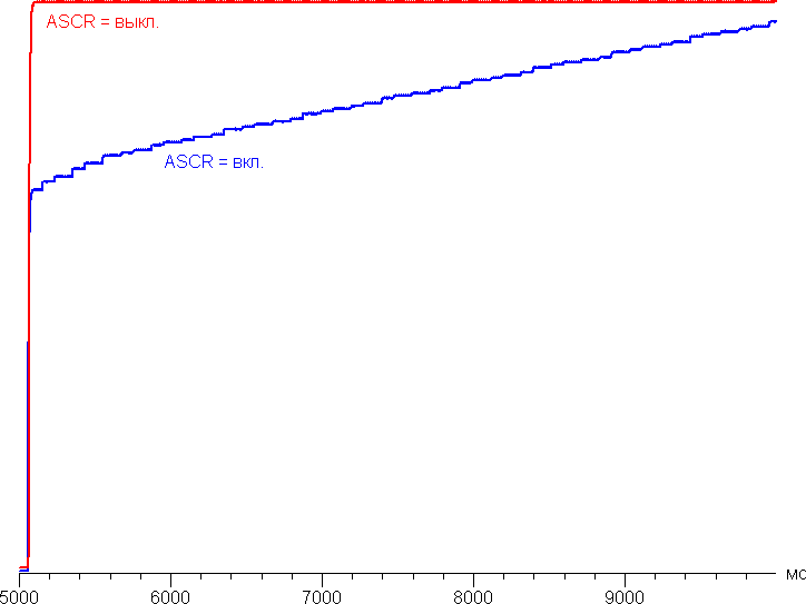 При включении режима ASCR при выводе черного поля на весь экран яркость подсветки медленно уменьшается вплоть до полного отключения подсветки (примерно через 10 с), при переключении на вывод белого поля — также медленно и почти линейно увеличивается. Практической пользы от этой функции немного, но производитель может указывать невероятно огромные значения контрастности. График ниже показывает, как увеличивается яркость (вертикальная ось) при переключении с черного поля (после 5 секунд вывода) на белое при выключенной и включенной динамической подстройке яркости: