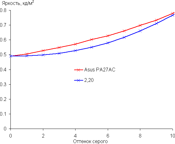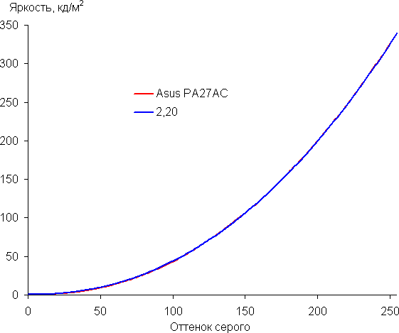 Аппроксимация полученной гамма-кривой дала показатель 2,20, что в точности равно стандартному значению 2,2, при этом реальная гамма-кривая очень мало отклоняется от аппроксимирующей степенной функции: