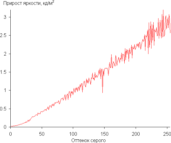 Реальная гамма-кривая ближе всего к стандартной при выборе Гамма = 2.2, поэтому далее мы измерили яркость 256 оттенков серого (от 0, 0, 0 до 255, 255, 255) при этом значении. График ниже показывает прирост (не абсолютное значение!) яркости между соседними полутонами: