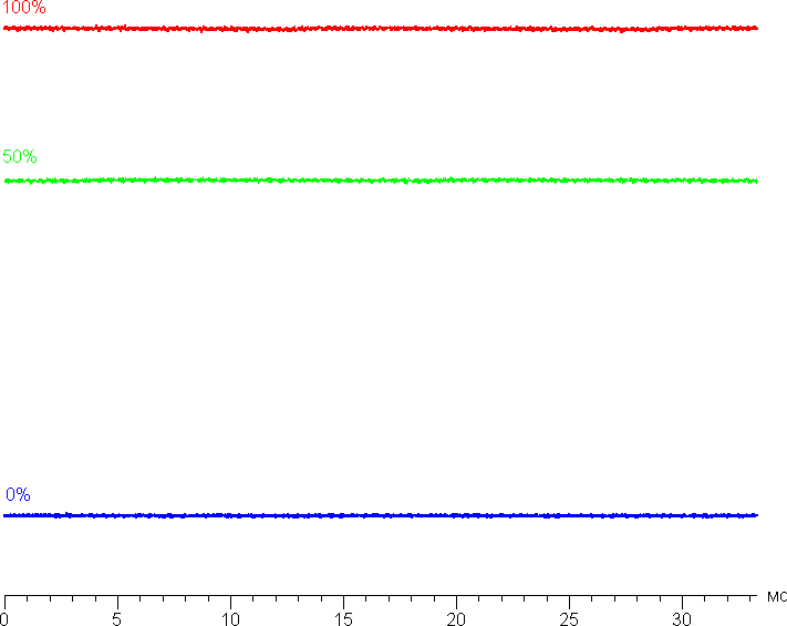 Яркость монитора меняется именно яркостью подсветки, то есть без ущерба для качества изображения (сохраняется контрастность и количество различимых градаций) яркость монитора можно менять в достаточно широких пределах, что позволяет с комфортом работать и смотреть фильмы как в освещенном, так и в темном помещении. На любом уровне яркости мало-мальски значимая модуляция подсветки отсутствует, что исключает видимое мерцание экрана. В доказательство приведем графики зависимости яркости (вертикальная ось) от времени (горизонтальная ось) при различных значениях настройки яркости: