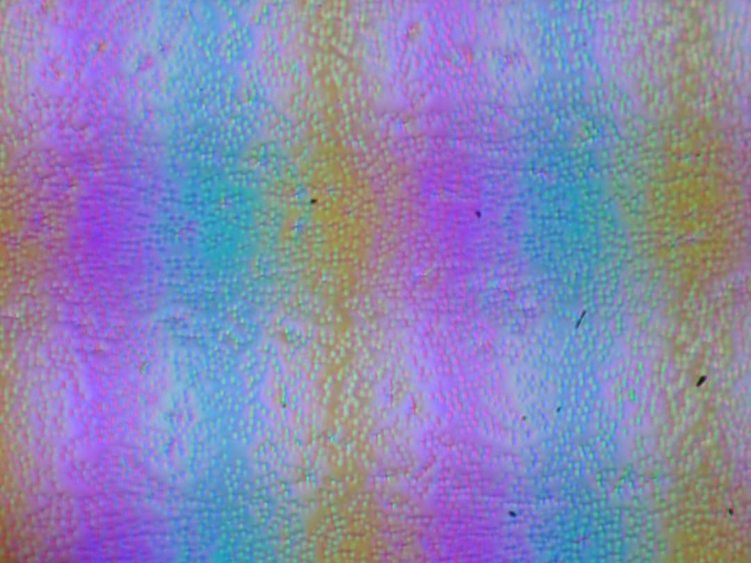 Зерно этих дефектов в несколько раз меньше размеров субпикселей (масштаб этих двух фотографий примерно одинаковый), поэтому фокусировка на микродефектах и «перескок» фокуса по субпикселям при изменении угла зрения выражены слабо, из-за этого нет и «кристаллического» эффекта.