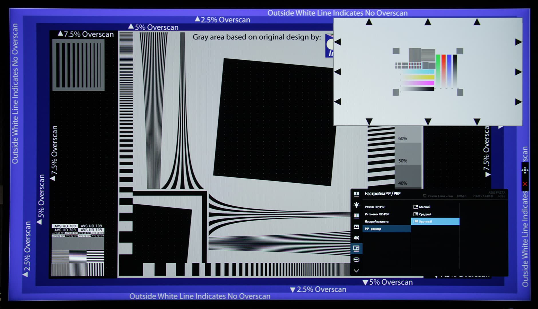 Присутствует функция двойного изображения картинка-в-картинке (PIP) и картинка-рядом-с-картинкой (PBP). В режиме PIP выбирается положение дополнительного окна в одном из четырех углов, а также его размер из трех возможных (но ни в одном мы не получили вывод пиксель в пиксель для дополнительного окна).