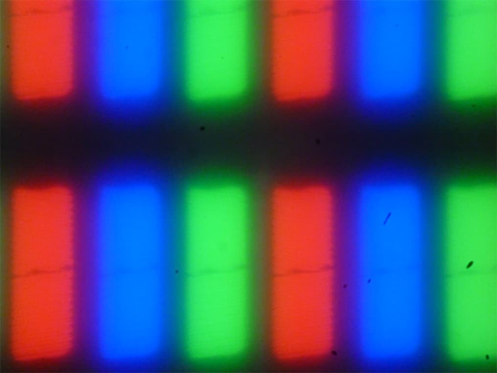 Четкое изображение структуры пикселей из-за матовой поверхности получить не удается, впрочем, при желании на фрагменте ниже можно разглядеть типичную для IPS структуру в виде параллельных полосок, а также, что каждый субпиксель делится на два примерно равных домена (черные точки — это пыль на матрице фотоаппарата):