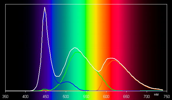 Ниже приведен спектр для белого поля (белая линия), наложенный на спектры красного, зеленого и синего полей (линии соответствующих цветов):