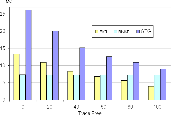 Время отклика зависит от значения настройки Trace Free, которая управляет разгоном матрицы. При 0 разгона нет, при 100 разгон максимальный (шаг регулировки равен 20). График ниже показывает, как меняется время включения и выключения при переходе черный-белый-черный (столбики вкл. и выкл.), а также среднее суммарное время для переходов между полутонами (столбики GTG):