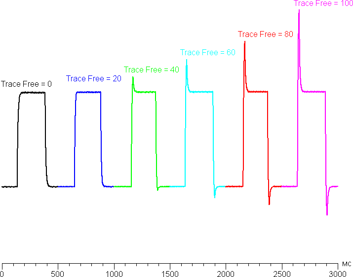 При значениях Trace Free выше 0 на графиках некоторых переходов появляются характерные всплески яркости, например, так выглядят графики для перехода между оттенками 40% и 60% (значения Trace Free приведены над графиками; по вертикали — яркость, по горизонтали — время, для наглядности графики выстроены последовательно):