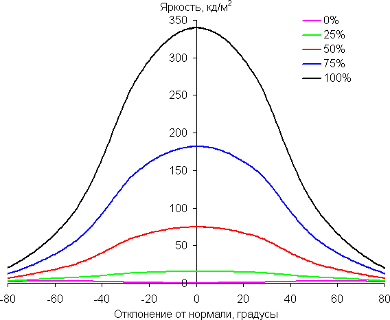 В качестве реперной точки можно выбрать отклонение в 45°, что может быть актуальным в случае, например, если изображение на экране рассматривают два человека одновременно. Критерием сохранения правильности цветов можно считать значение ΔE меньше 3. Стабильность цветов хорошая, это является одним из главных достоинств матрицы типа IPS.