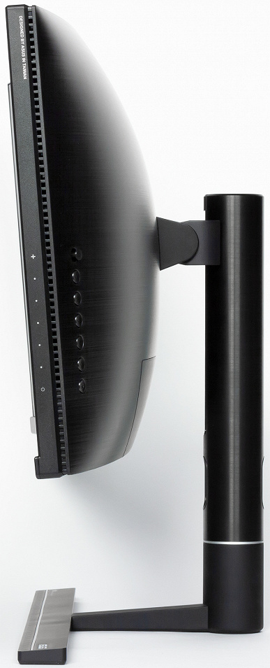 Верхняя цилиндрическая часть стойки — это цельнометаллическая фрезерованная деталь из алюминиевого сплава, анодированная и тонированная в черный цвет. Сзади на этой детали есть вертикальная прорезь, закрытая окошком из прозрачного пластика. Через прорезь видно указатель, отмечающий текущую высоту. Возможно, это имеет какую-то практическую ценность, но с виду — это просто декорация. В передней части основания подставки есть блестящая полоска и рельефные метки через сантиметр. Это уже точно исключительно декоративный элемент, как и серебристая вставка между верхней цилиндрической частью стойки и основанием. На шарнире между этими частями подставки блок экрана вместе с верхней цилиндрической частью стойки поворачивается вправо-влево. Нижняя часть стойки, переходящая в палку Т-образного основания, изготовлена также из алюминиевого сплава, анодированного и имеющего стойкое черное матовое покрытие. Перекладина основания закрыта кожухом из пластика. Все несущие элементы подставки изготовлены из штампованной стали и из алюминиевого сплава. Снизу на основание подставки наклеены черные резиновые площадки, благодаря чему монитор фиксируется на гладких поверхностях и не царапает их при перемещении.