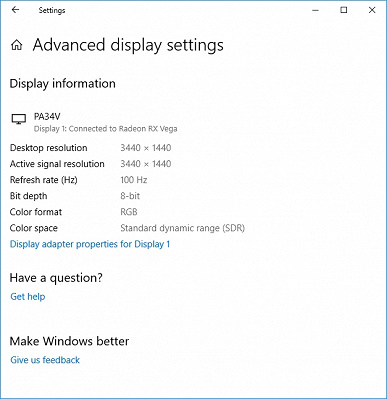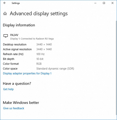 А также HDR (10 бит на цвет в случае подключения по DisplayPort/Thunderbolt; по HDMI — те же 8 бит на цвет, дополненных динамическим смешением цветов, видимо, с помощью видеокарты на аппаратном уровне). После снижения частоты обновления до 60 Гц — по HDMI уже 12 бит на цвет.