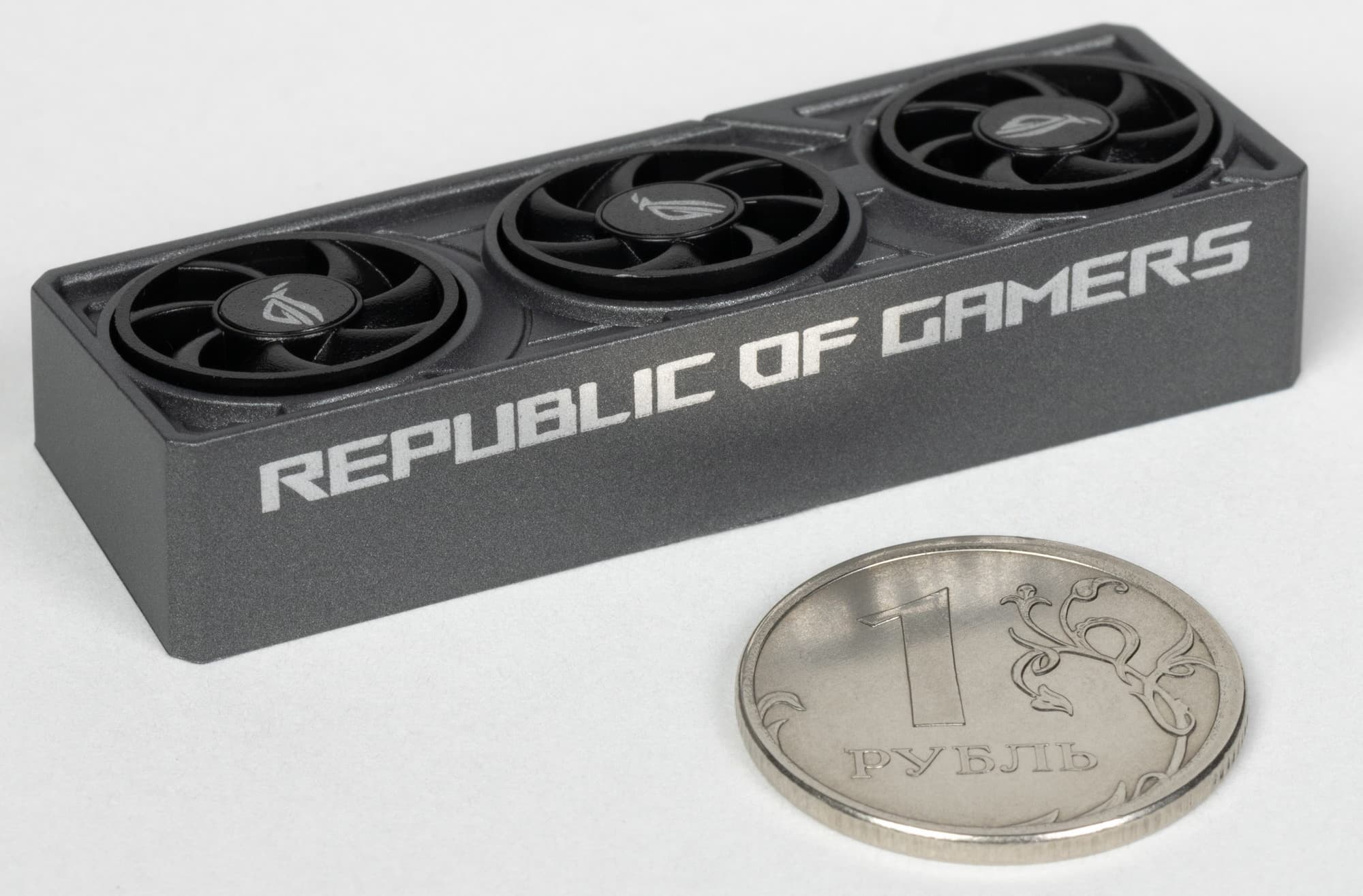 Система охлаждения крайне мощная, высокоэффективная, а в режиме BIOS Q mode — еще и тихая. Как следствие, карта очень массивная и имеет большие размеры: 36 см в длину и 15 см в высоту, а по толщине она занимает 4 слота в корпусе. Набор видеовыходов — 3 DP 2.1b и 2 HDMI 2.1b, но одновременно можно подключить те же 4 приемника сигнала. Подсветка простая, ее можно синхронизировать с материнскими платами Asus через приложение Armoury Crate.