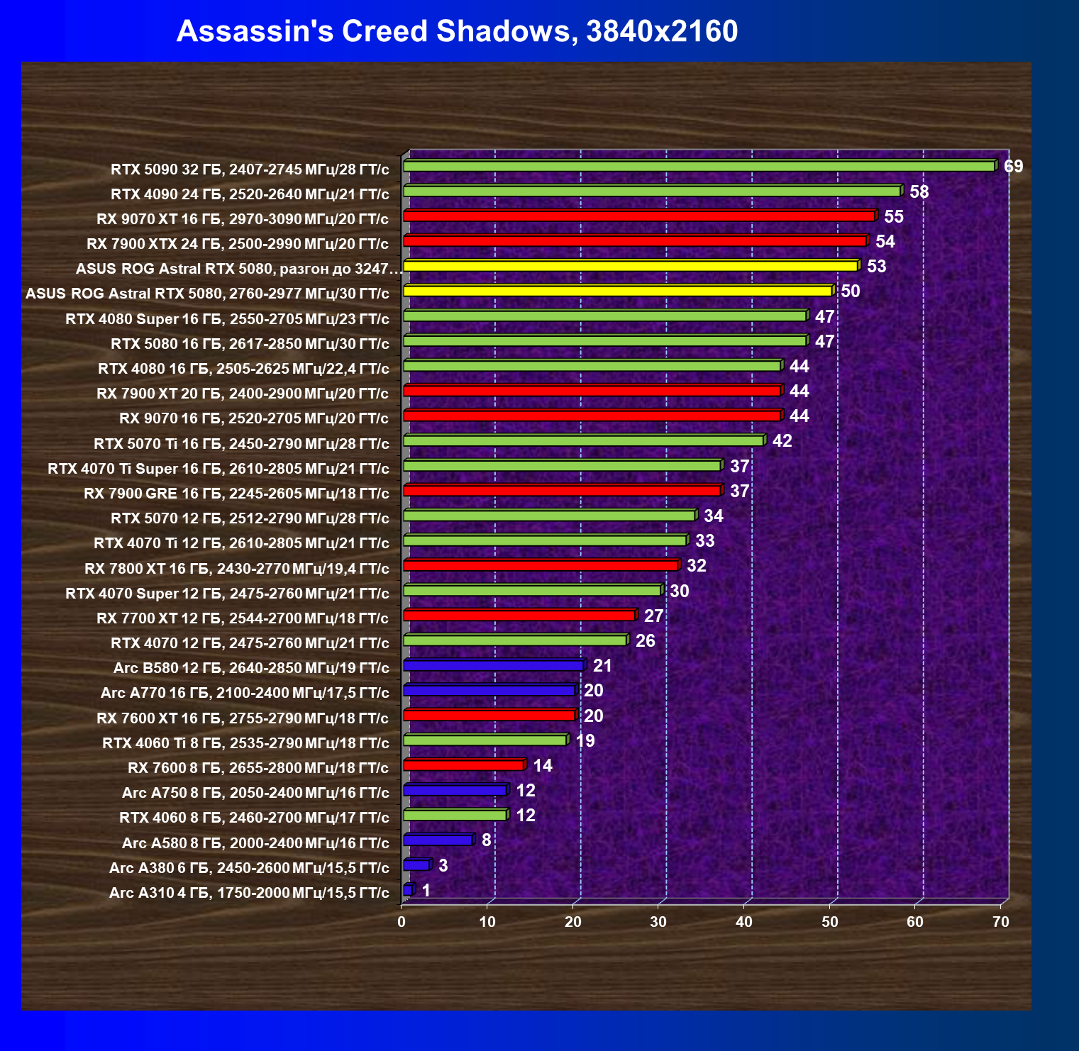 | 03 | Asus ROG Astral RTX 5080, 2760—2977 МГц/30 ГТ/с | 13838 | 769 | 180 000 |