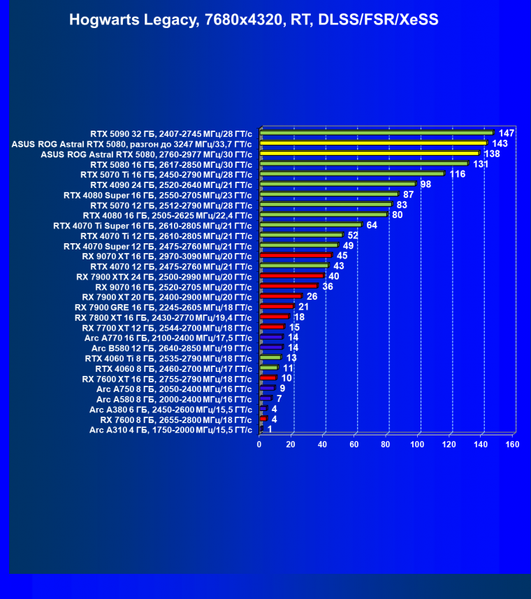 Результаты тестов с включенной аппаратной трассировкой лучей и DLSS/FSR/XeSS в разрешении 7680×4320 (8К)