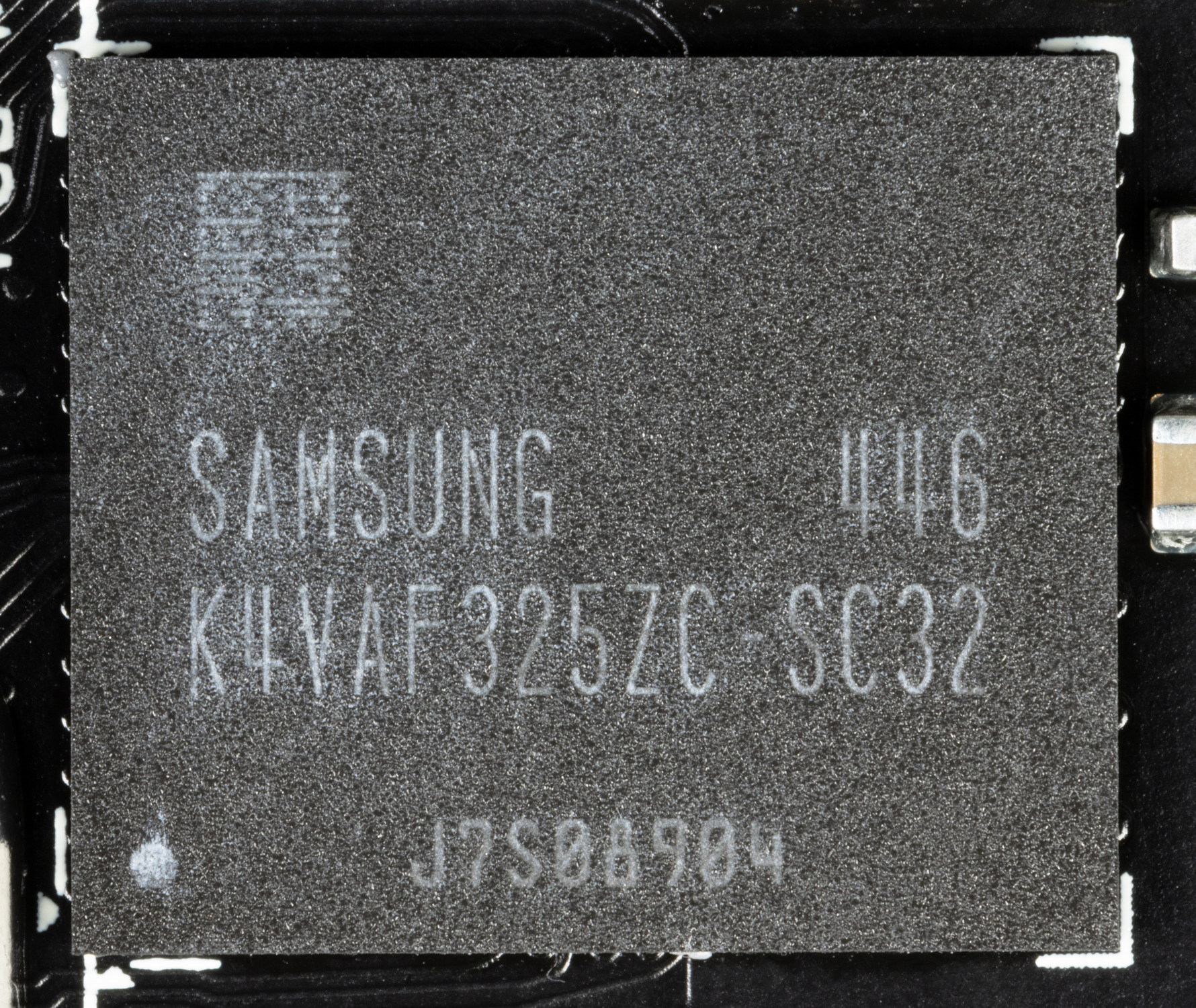Карта имеет 16 ГБ памяти GDDR7 SDRAM, размещенной в 8 микросхемах по 16 Гбит на лицевой стороне PCB. Микросхемы памяти Samsung (K4VAF325ZC-SC32) рассчитаны на номинальную частоту работы в 2666 МГц (эффективная ПСП 32 Гбит/с).