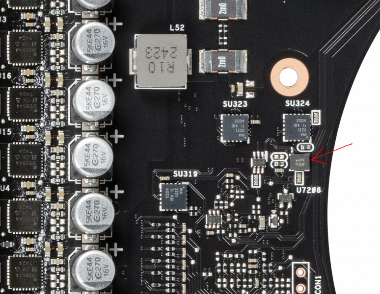 В преобразователе питания ядра и микросхем памяти используются транзисторные сборки DrMOS — SiC654A от Vishay, рассчитанные на 50 А.