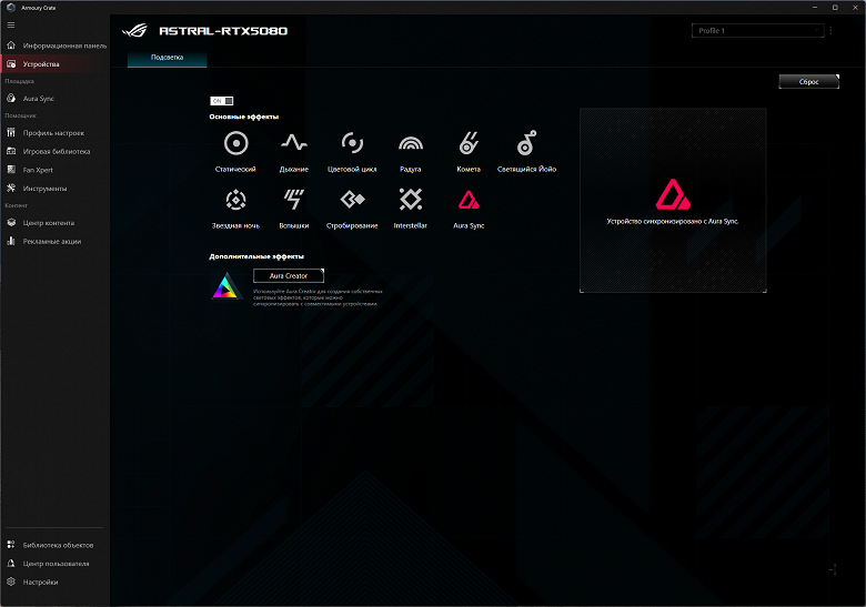 Управление режимами подсветки, в том числе и ее отключением, осуществляется утилитой Asus Armoury Crate. Вариантов сценариев немного, однако имеется программа-компаньон Aura Creator, с помощью которой можно создать свои собственные сценарии подсветки. Подсветка может синхронизироваться с материнскими платами, но только Asus. Этот факт сильно обедняет возможности подсветки.