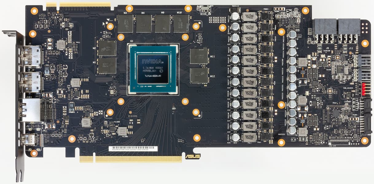 Карта Nvidia Founder’s Edition имеет 8-фазную схему питания, а инженеры Asus применили усиленный вариант из 10 фаз на GPU и 2 фаз на микросхемы памяти. Используются те же наборы Driver MOSFET, что и у всего семейства Turing. ШИМ-контроллером является микросхема uP9512P (uPI Semiconductor). Из-за усложнения схемы питания, а также из-за громоздкой системы охлаждения размеры PCB сильно выросли, особенно в высоту. Традиционно для Asus, система питания исполнена по технологии Super Alloy Power II, в ней использованы современные твердотельные конденсаторы. Мониторинг состояния осуществляет контроллер IT8705F/AF производства компании ITE (Integrated Technology Express).