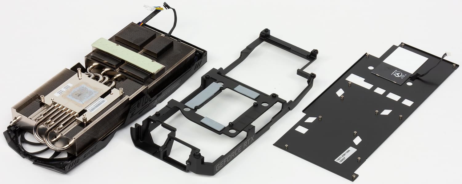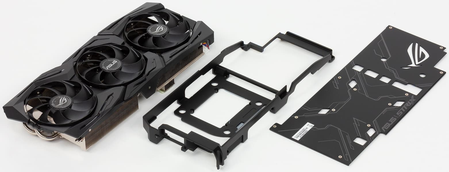 Как во всех СО серии Strix, основным элементом является сдвоенный пластинчатый радиатор, покрытый никелем. Обе части радиатора соединены тепловыми трубками, разносящими тепло по ребрам. Микросхемы памяти охлаждаются специальной пластиной, прикрученной к радиатору, а для силовых элементов имеется подошва с термоинтерфейсом на второй части радиатора. На обороте карты установлена толстая пластина, служащая не только элементом жесткости для массивной карты, но и охладителем PCB; также она несет на себе фирменный подсвеченный логотип ROG.