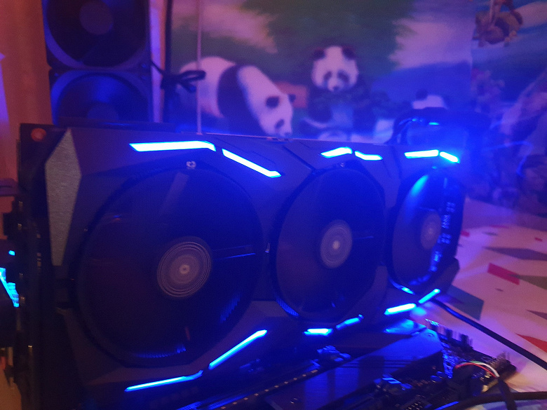 В принципе, относительно той красоты, что мы видели в случае карты MSI GeForce RTX 2080, тут все немного скромнее. Тем не менее, подсветка очень эффектная, а главное, что она есть и на обороте карты — как раз на том участке, который виден через боковое стекло в моддинговых корпусах (мы говорим о традиционном горизонтальном монтаже карты в корпус, когда вентиляторы не видны и напоказ выставлен лишь торец ускорителя). Можно использовать райзер для вертикальной установки карты вне слота материнской платы (если корпус допускает такой вариант), однако в данном случае трудно сказать, что лучше: подсветка «разбросана» по всей карте.