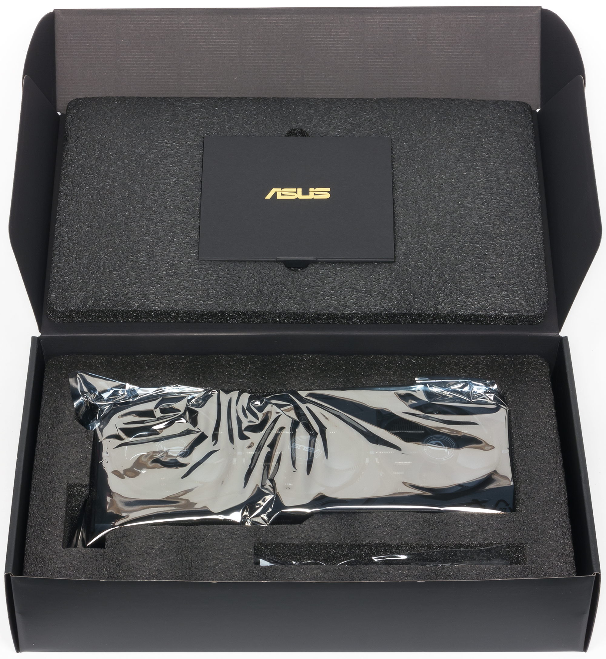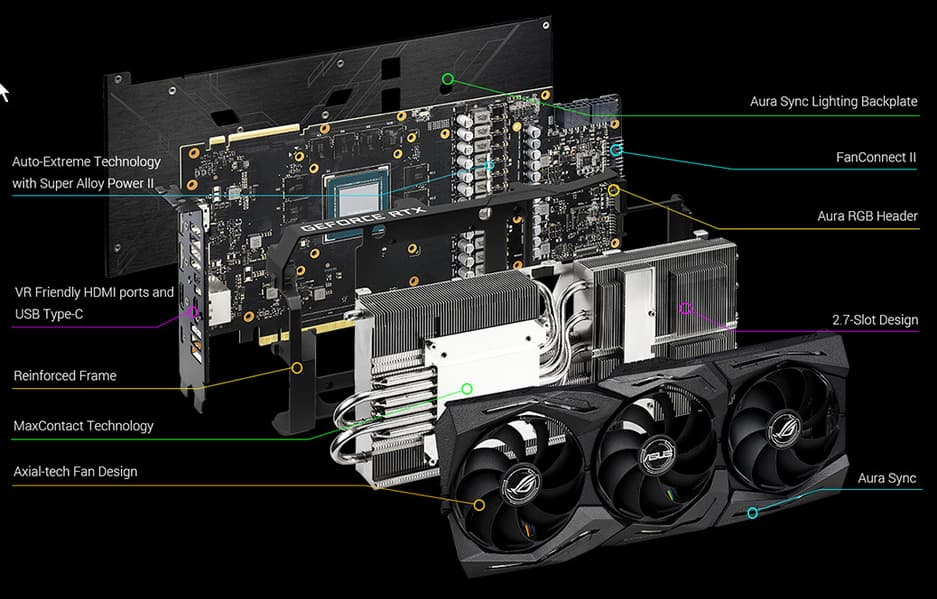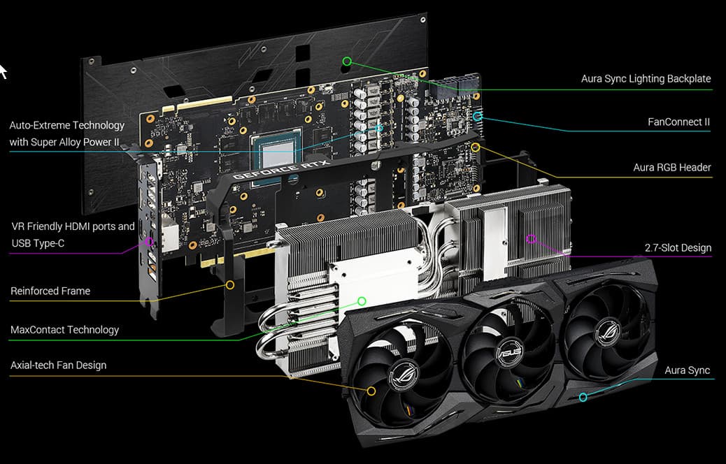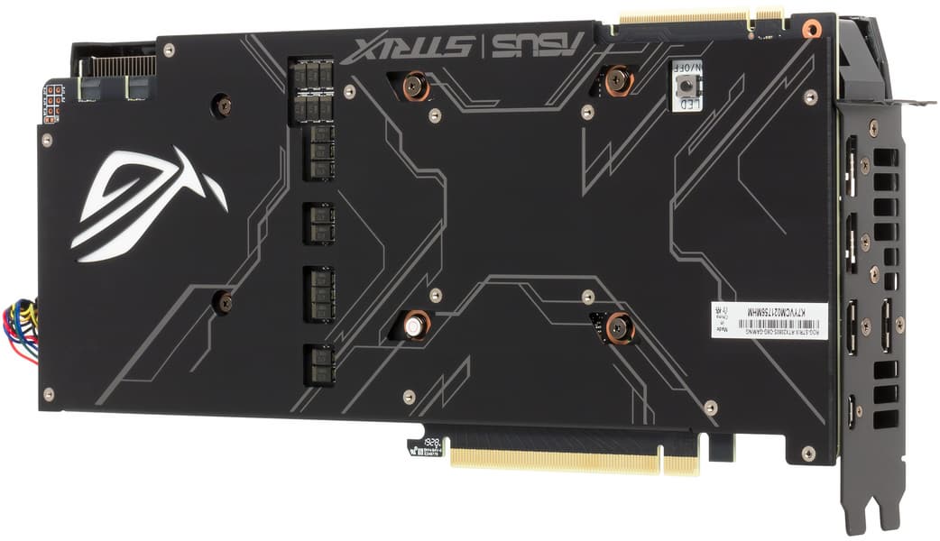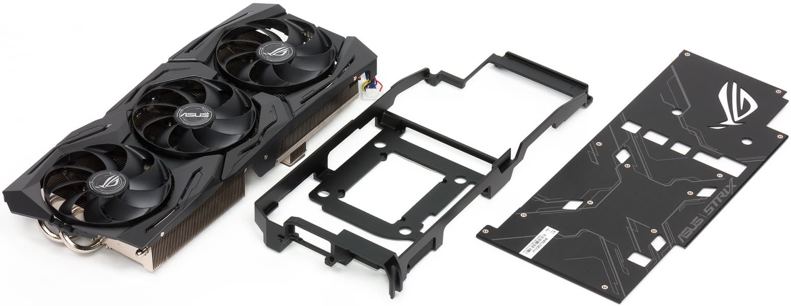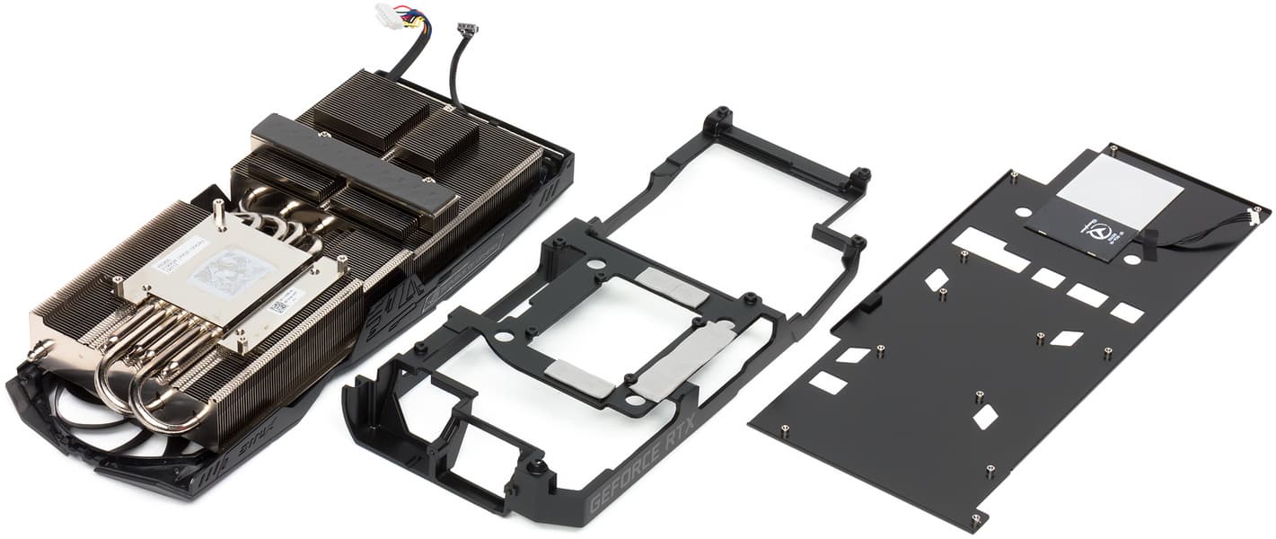 Как во всех СО серии Strix, основным элементом является сдвоенный пластинчатый радиатор, покрытый никелем. Обе части радиатора соединены тепловыми трубками, разносящими тепло по ребрам. Микросхемы памяти охлаждаются специальной пластиной, прикрученной к радиатору, а для силовых элементов имеется подошва с термоинтерфейсом на второй части радиатора. На обороте карты установлена толстая пластина, служащая не только элементом жесткости для массивной карты, но и охладителем PCB; также она несет на себе фирменный подсвеченный логотип ROG.