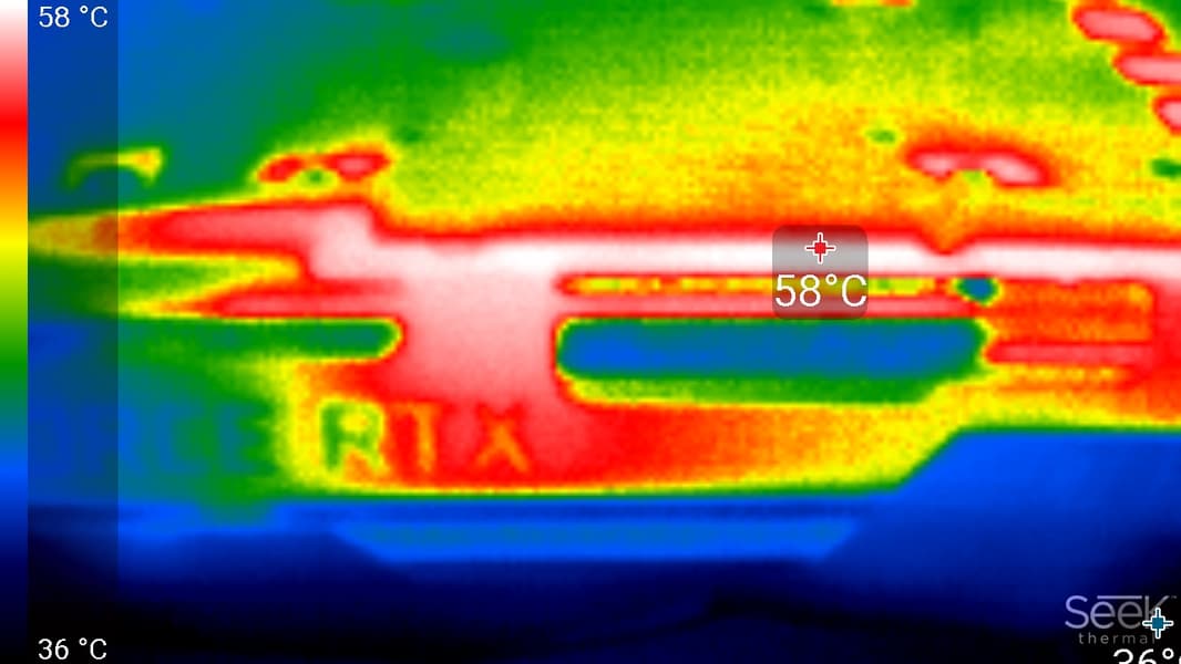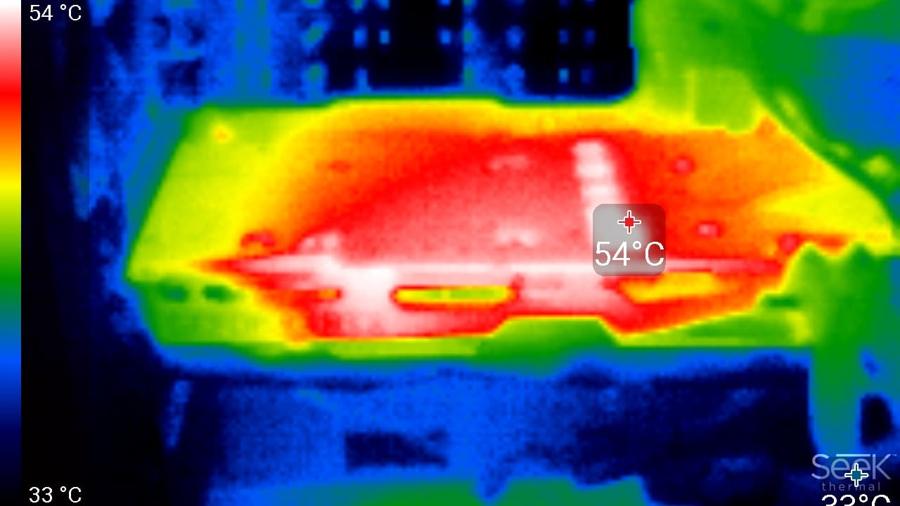 Максимальный нагрев — центральный участок PCB около GPU и силовых преобразователей.