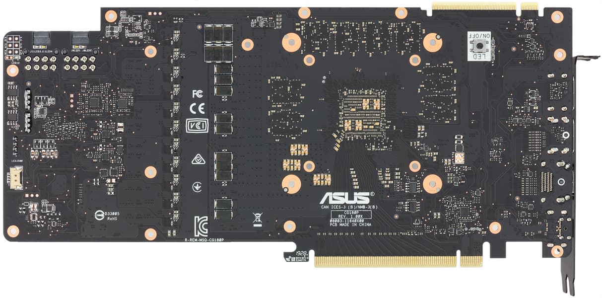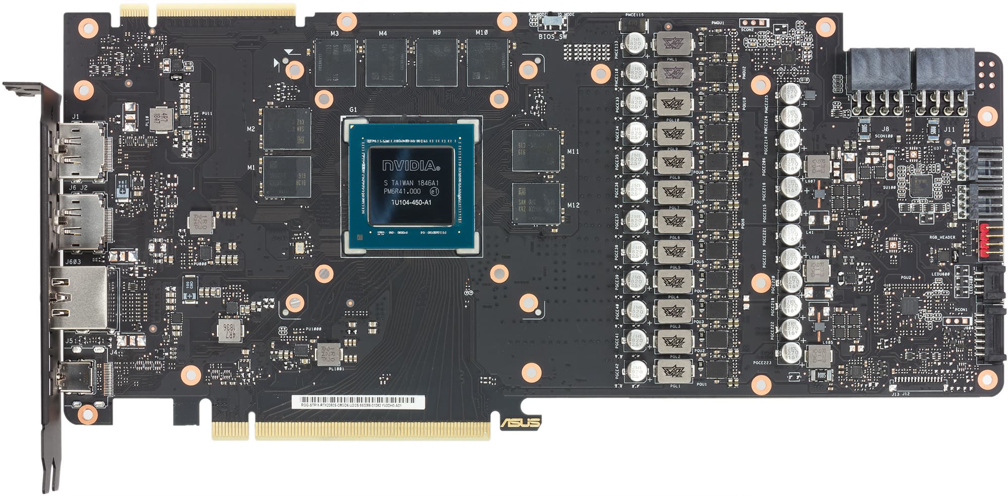 Карта Nvidia Founders Edition имеет 8-фазную схему питания, а инженеры Asus применили усиленный вариант из 10 фаз на GPU и 2 фаз на микросхемы памяти. Используются те же наборы Driver MOSFET, что и у всего семейства Turing. ШИМ-контроллером является микросхема uP9512P (uPI Semiconductor) (через удвоители фаз, ибо контроллер рассчитан максимум на 8 фаз). Из-за усложнения схемы питания, а также из-за громоздкой системы охлаждения размеры PCB сильно выросли, особенно в высоту. Традиционно для Asus, система питания исполнена по технологии Super Alloy Power II, в ней использованы современные твердотельные конденсаторы. Мониторинг состояния осуществляет контроллер IT8705F/AF производства компании ITE (Integrated Technology Express). На его основе функционирует технология FanConnect II: на торце в хвостовой части карты имеются два 4-контактных разъема питания для корпусных вентиляторов. Можно заставить подключенные к ним вентиляторы работать в соответствии с нагревом GPU, увеличивая или уменьшая частоту вращения.