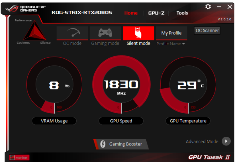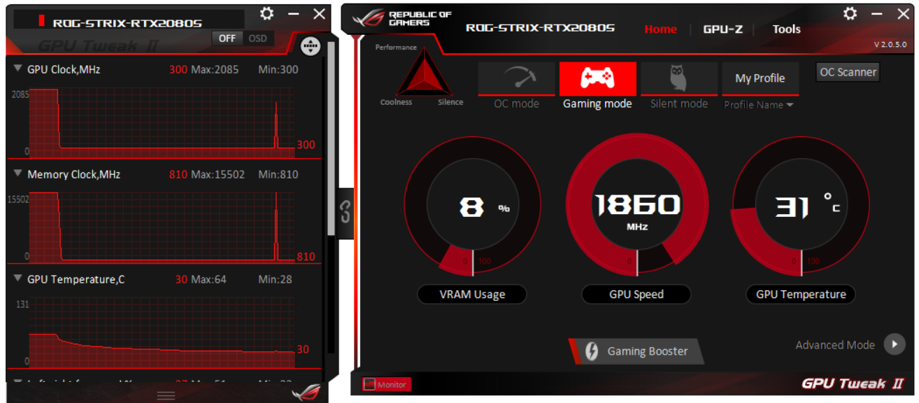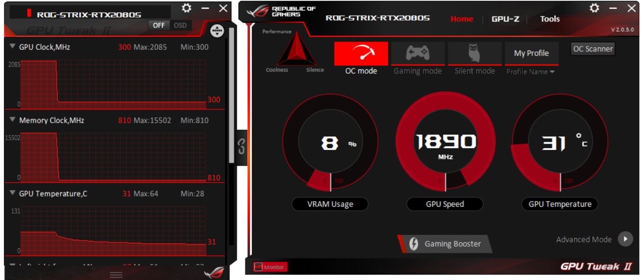 Штатная частота работы ядра в режиме OC Mode повышена на 4,6% относительно референсных значений, так что можно ожидать прироста производительности в 4%. Для управления работой карты можно использовать фирменную утилиту GPU Tweak II:
