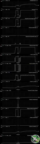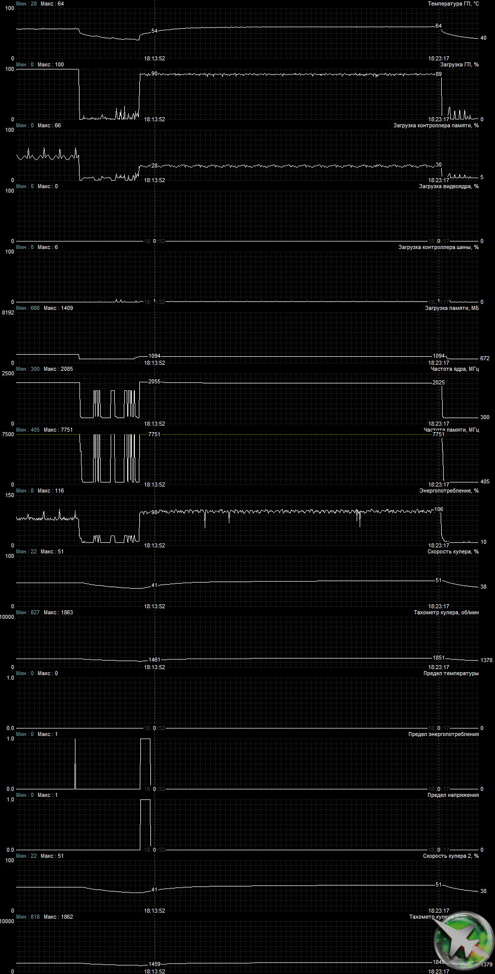 После 6-часового прогона под нагрузкой максимальная температура ядра не превысила 64 градусов, что является отличным результатом для видеокарты такого уровня.