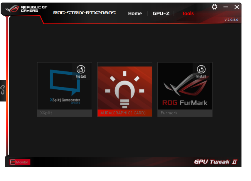 На обороте карты есть кнопка включения/выключения подсветки кулера (режим Stealth Ninja). А в целом управлять подсветкой можно в специальной утилите Asus Aura (об этом ниже). Разумеется, ускоритель поддерживает технологию Nvidia G-Sync.