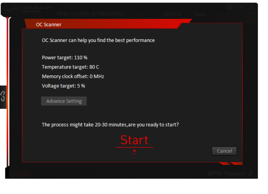 Я воспользовался автоматическим разгоном (на основе NV Scanner, в данном случае кнопка названа «OC Scanner»), который совсем немного повысил частоту работы (+3% к референсным значениям, то есть даже OC Mode дает более высокие частоты). Разумеется, достать RTX 2080 Ti таким образом все равно не получится: компания Nvidia приняла все меры, чтобы «перехлестов» не случилось, например, ограничила потребление при разгоне.