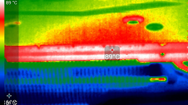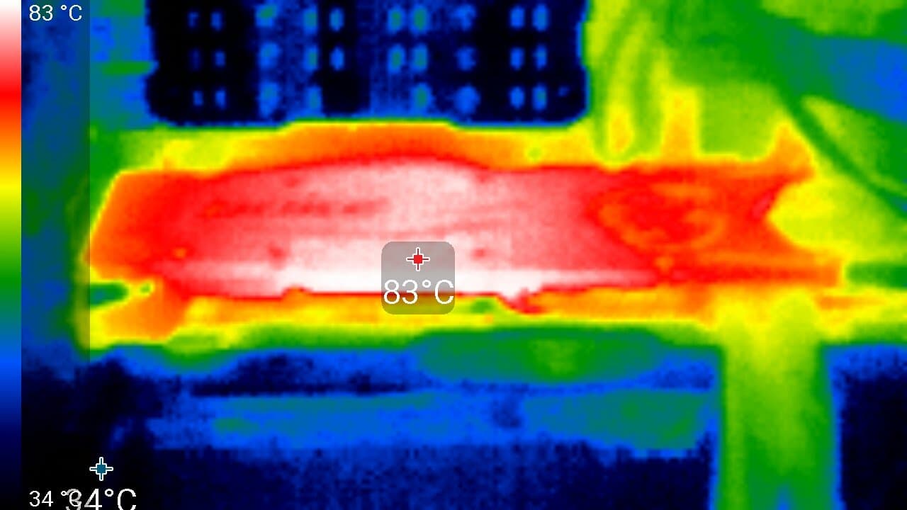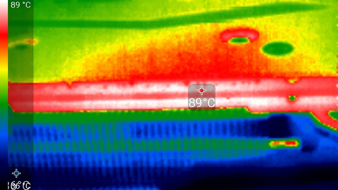 Максимальный нагрев — верхний край оборотной стороны PCB.