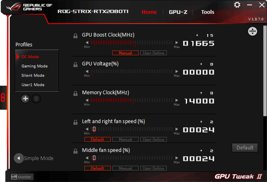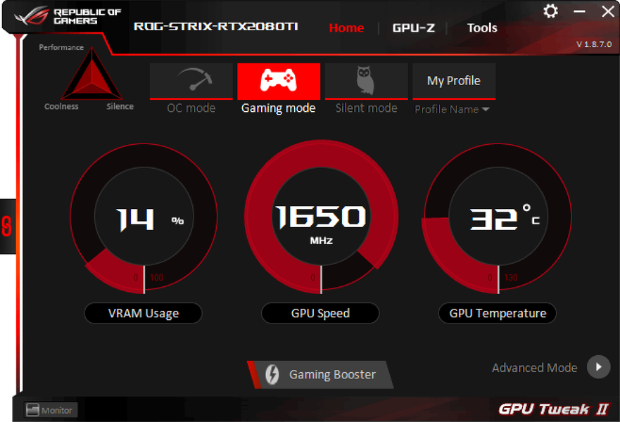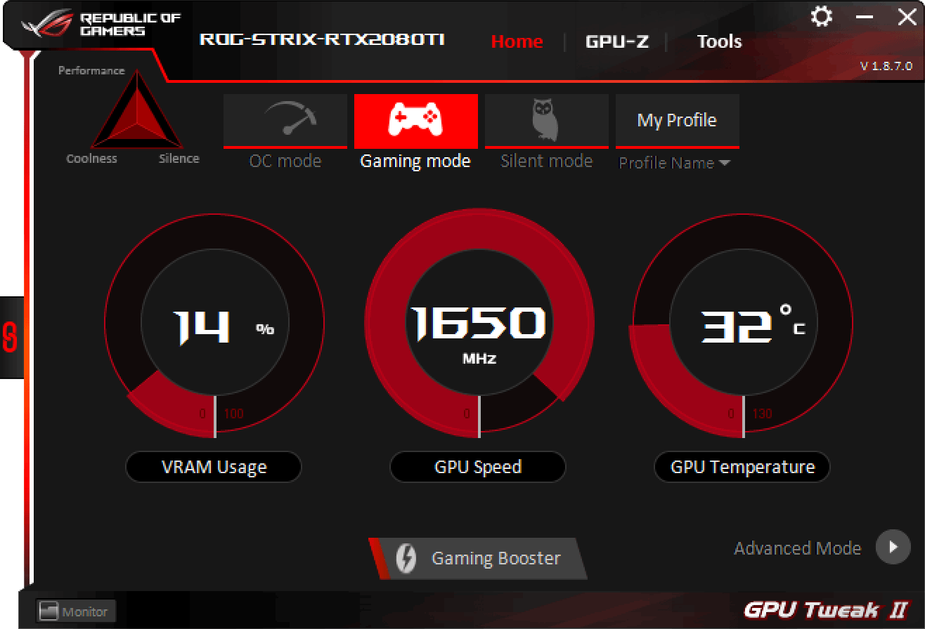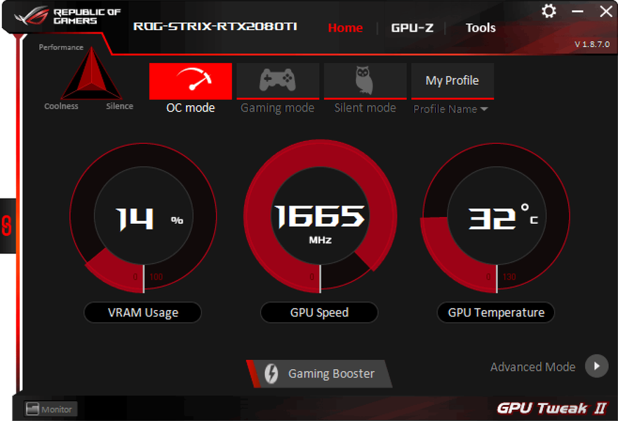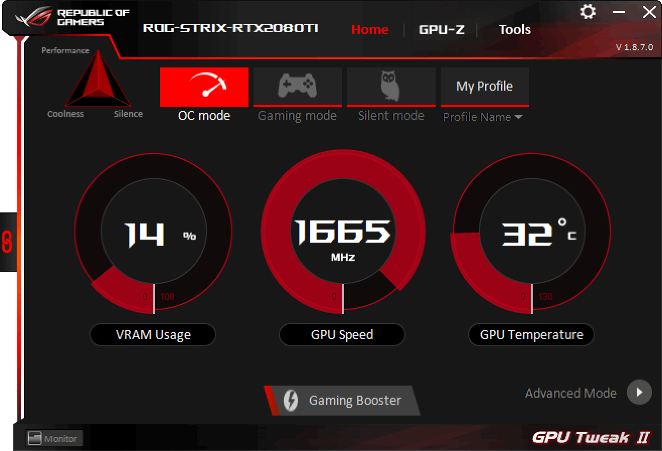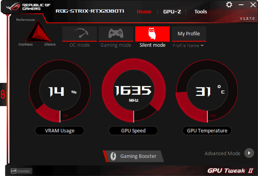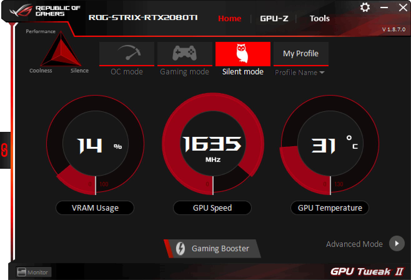 Управление работой карты обеспечивается с помощью фирменной утилиты Asus GPU Tweak II, которую можно скачать с сайта производителя.