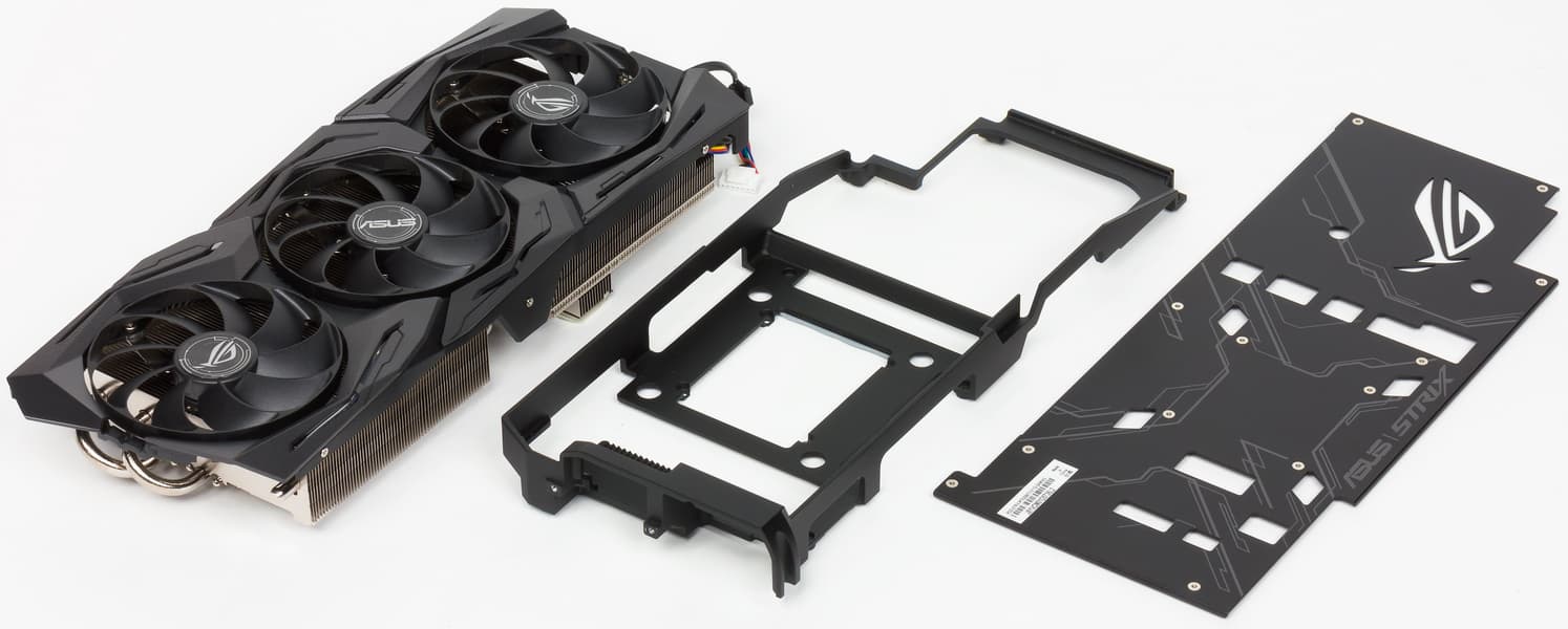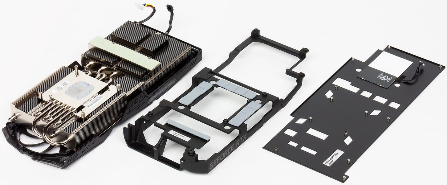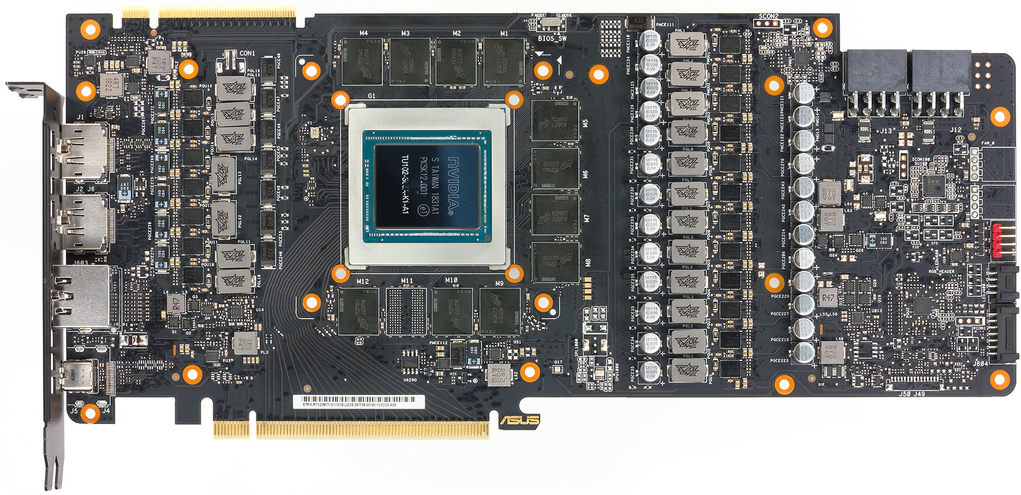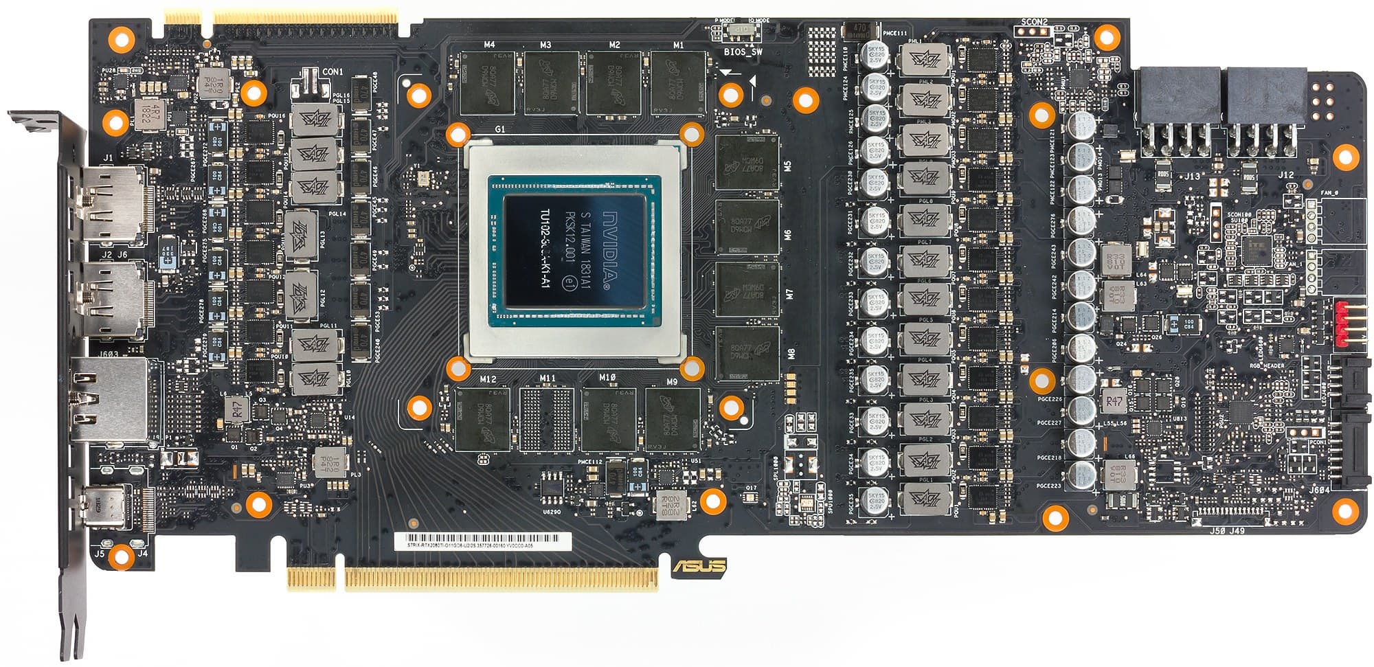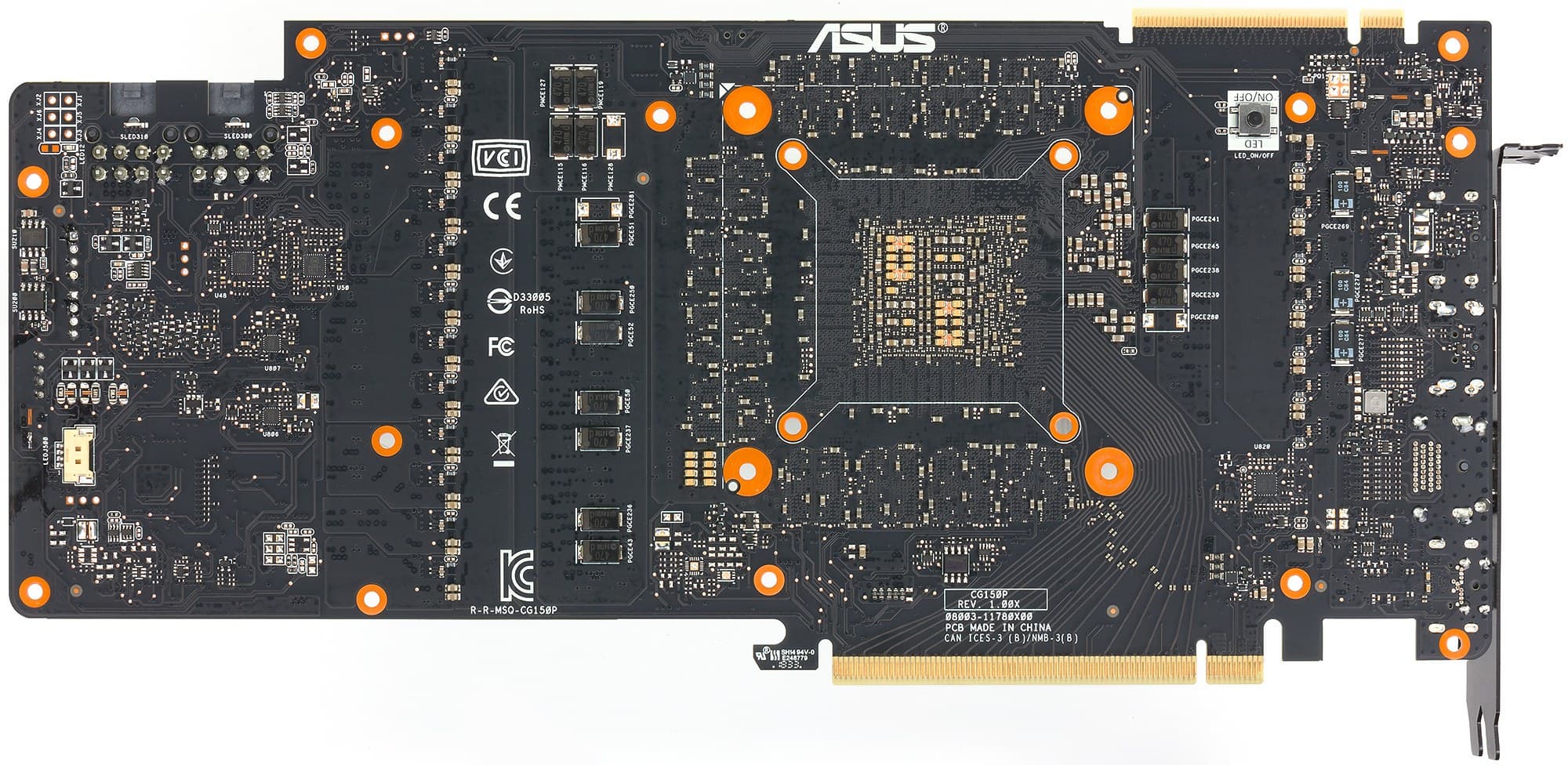 Традиционно для карт Asus серии Strix, печатная плата полностью разработана инженерами компании. PCB имеет разведенную шину обмена с памятью в 384 бит, то есть можно установить до 12 32-битных микросхем памяти суммарным объемом в 12 ГБ, просто одна микросхема не установлена, таким образом получен объем в 11 ГБ и шина обмена с памятью в 352 бит.